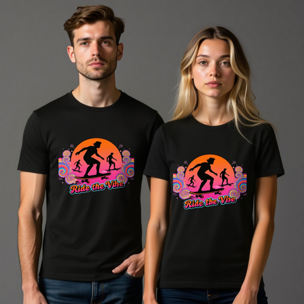 This unisex staple t-shirt features a vibrant ‘Ride the Vibe’ skateboard graphic with retro swirls and sunset hues. Designed for comfort and style, it’s a versatile black tee perfect for casual wear. The bold silhouette design captures skate culture energy—ideal for fans of vintage aesthetics and active lifestyles. Durable, everyday wear for all.