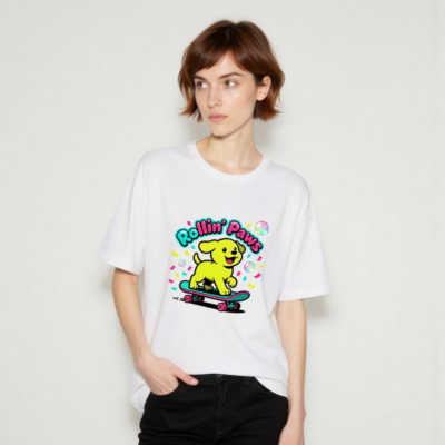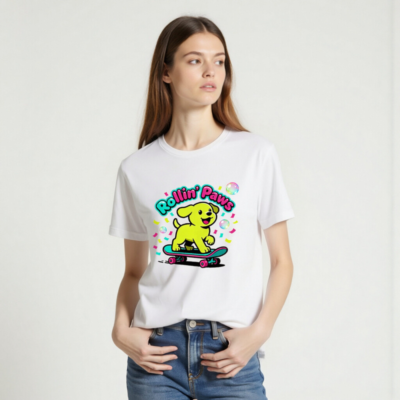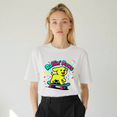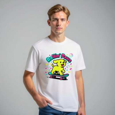 This unisex staple t-shirt features a vibrant, playful design: a cheerful yellow puppy riding a teal skateboard with pink wheels, surrounded by confetti and bubbles. The bold ‘Rollin’ Paws’ text adds fun retro flair. Made for everyday comfort, this classic fit tee suits casual wear for all ages. Ideal for dog lovers and skate culture fans—bright, joyful, and effortlessly stylish.