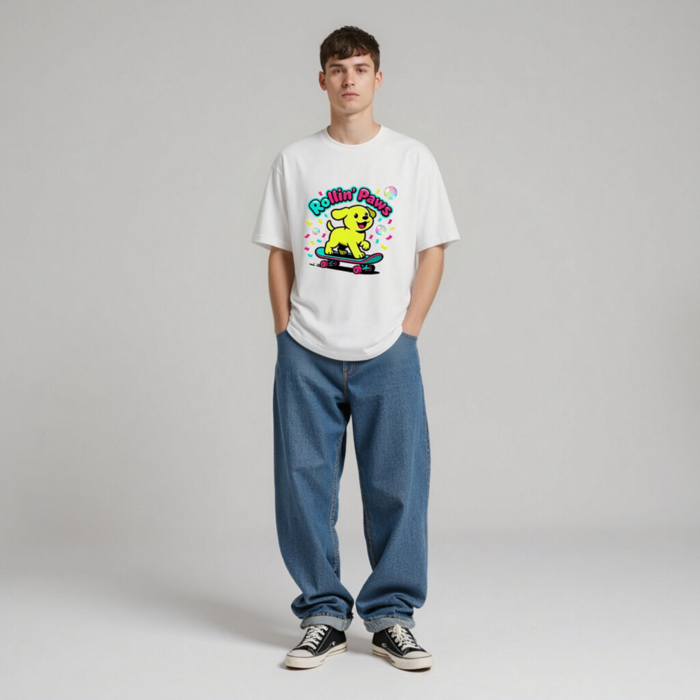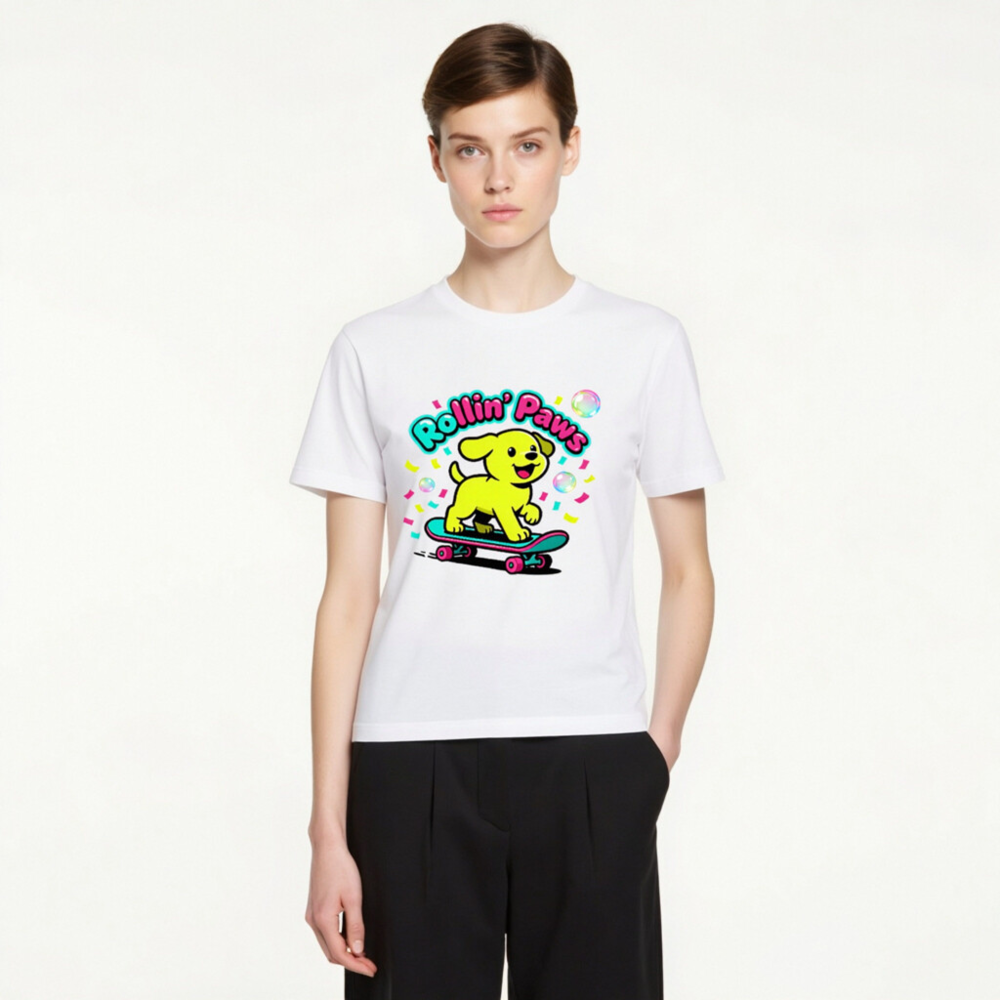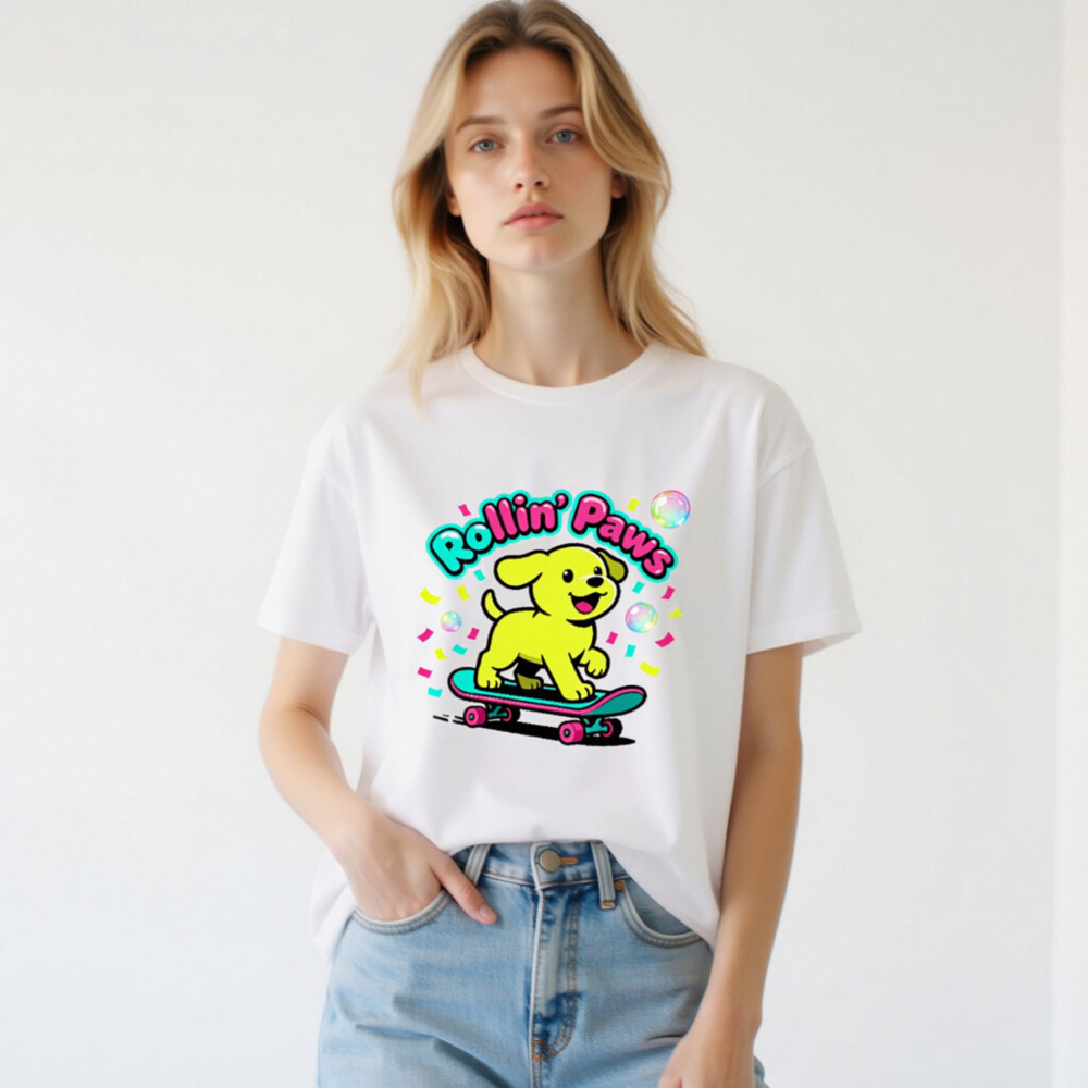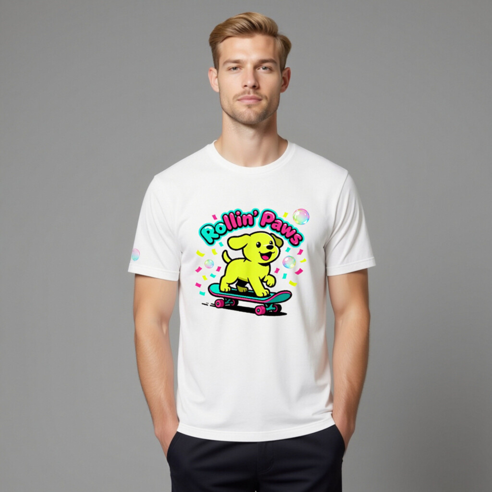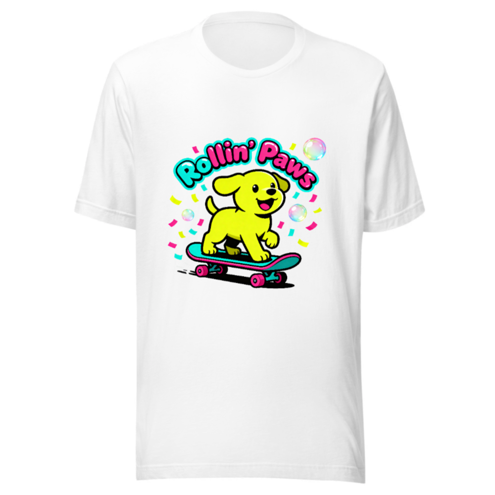 This unisex staple t-shirt features a vibrant, playful design: a cheerful yellow puppy riding a teal skateboard with pink wheels, surrounded by confetti and bubbles. The bold ‘Rollin’ Paws’ text adds fun retro flair. Made for everyday comfort, this classic fit tee suits casual wear for all ages. Ideal for dog lovers and skate culture fans—bright, joyful, and effortlessly stylish.