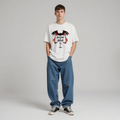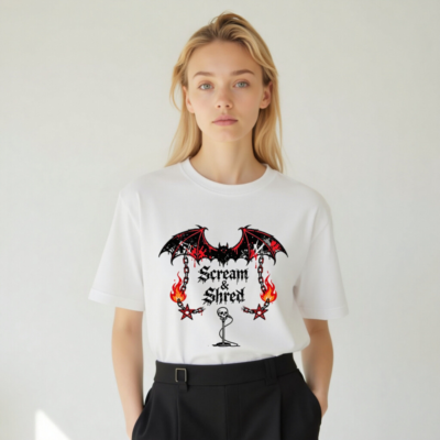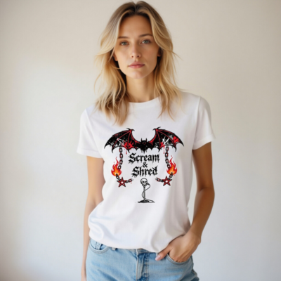 This unisex staple t-shirt features a bold ‘Scream & Shred’ graphic with a blood-splattered bat, flaming chains, pentagrams, and a skull microphone—perfect for rock/metal fans. Made from premium cotton, it offers a comfortable fit for everyday wear. The design combines dark aesthetics with high-contrast red/black detailing for maximum visual impact. Ideal for concerts, festivals, or casual style. Machine washable for easy care.