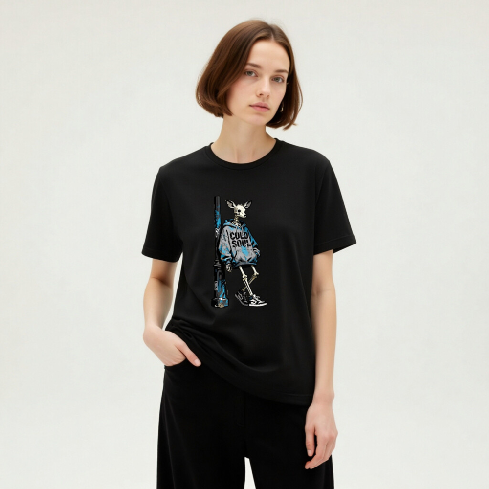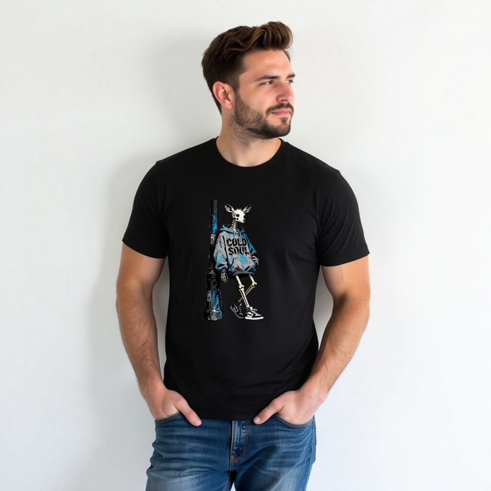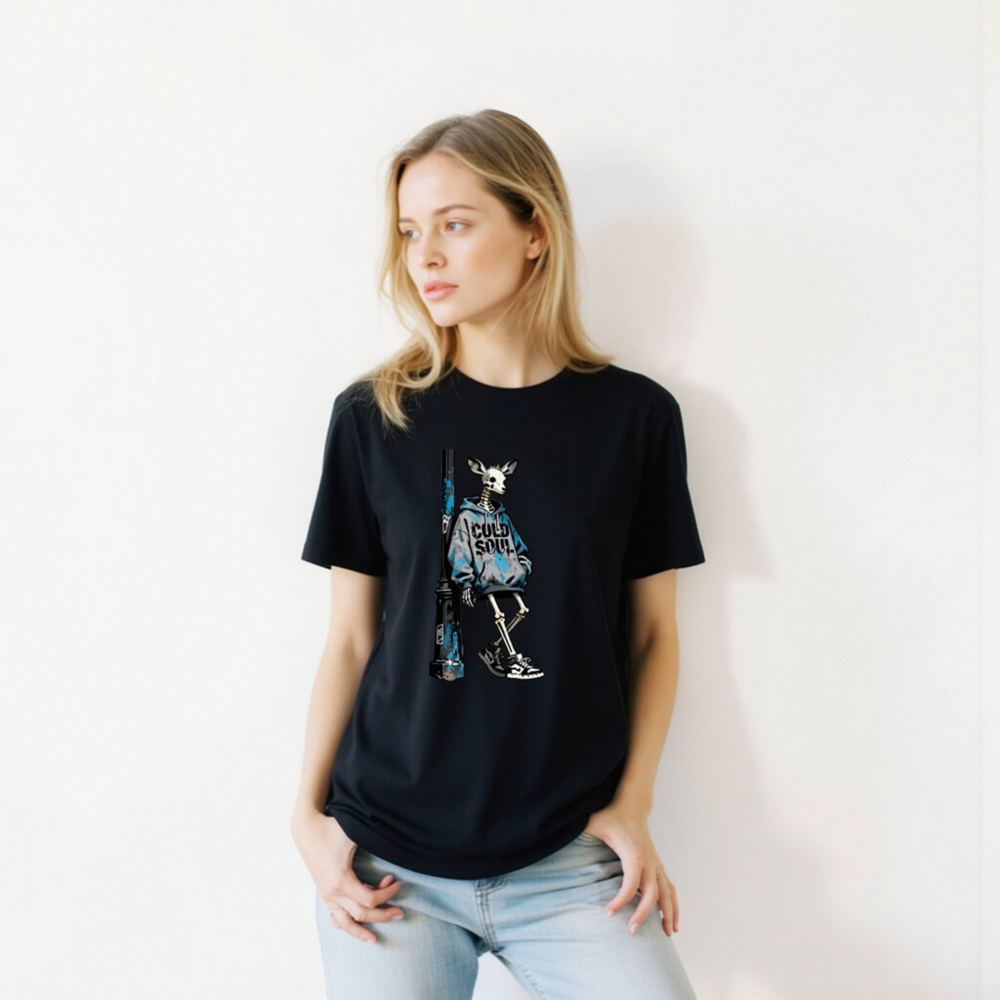 This unisex staple t-shirt features a striking street art design: a skeletal deer wearing a blue hoodie with ‘COLD SOUL’ printed on the front, leaning against a weathered lamppost. The graphic blends urban grit with surreal charm, ideal for fans of alternative fashion and bold self-expression. Made for everyday wear, this versatile tee pairs effortlessly with jeans or streetwear styles. Perfect for those who appreciate unique, artistic apparel that stands out.