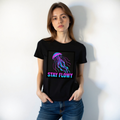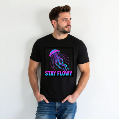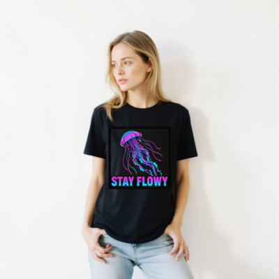 Show your vibe with this unisex staple t-shirt featuring a vibrant neon jellyfish graphic in purple and blue tones. The ‘Stay Flowy’ slogan adds playful positivity—perfect for casual wear or self-expression. Made for comfort, it fits true to size and pairs well with jeans or shorts. Ideal for ocean lovers, yoga enthusiasts, or anyone who embraces fluidity and calm. Designed for everyday ease.