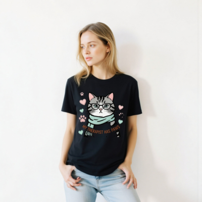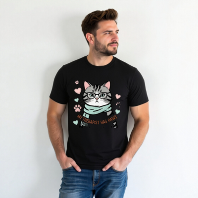 This unisex staple t-shirt features a charming gray tabby cat wearing glasses and a teal scarf, surrounded by paw prints and hearts. The playful design includes the witty phrase ‘My Therapist Has Paws’—perfect for cat lovers seeking comfort, humor, and cozy style. Made for everyday wear, this soft cotton blend offers a relaxed fit. Ideal as a gift or personal treat for animal therapy enthusiasts. Lightweight, breathable, and machine-washable for easy care.