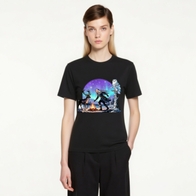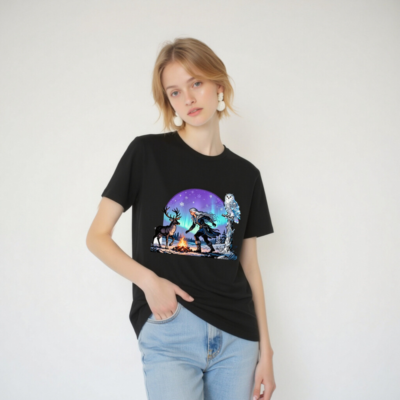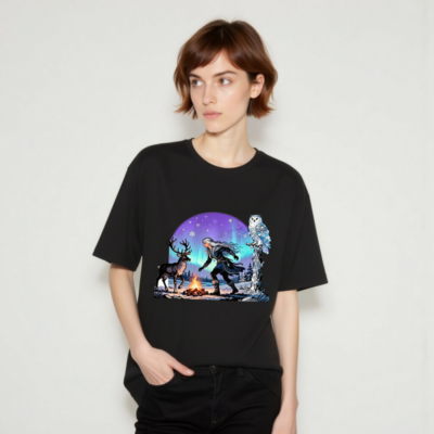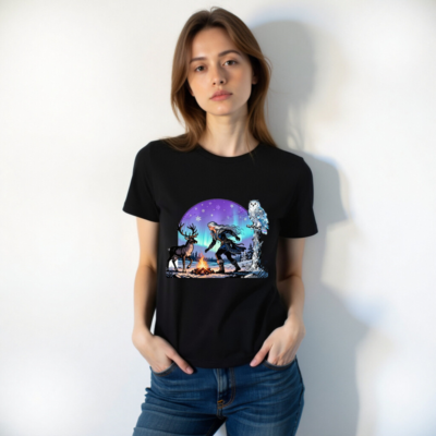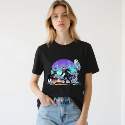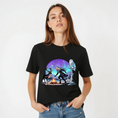 This unisex black staple t-shirt features a captivating winter scene: a silver-haired figure by a campfire, a majestic stag, and a snowy owl perched on an ice-covered tree. The vibrant aurora backdrop with falling snow enhances the magical forest vibe. Crafted for comfort and style, this versatile tee suits casual wear year-round. Ideal for nature lovers and fantasy enthusiasts seeking cozy, artistic apparel.