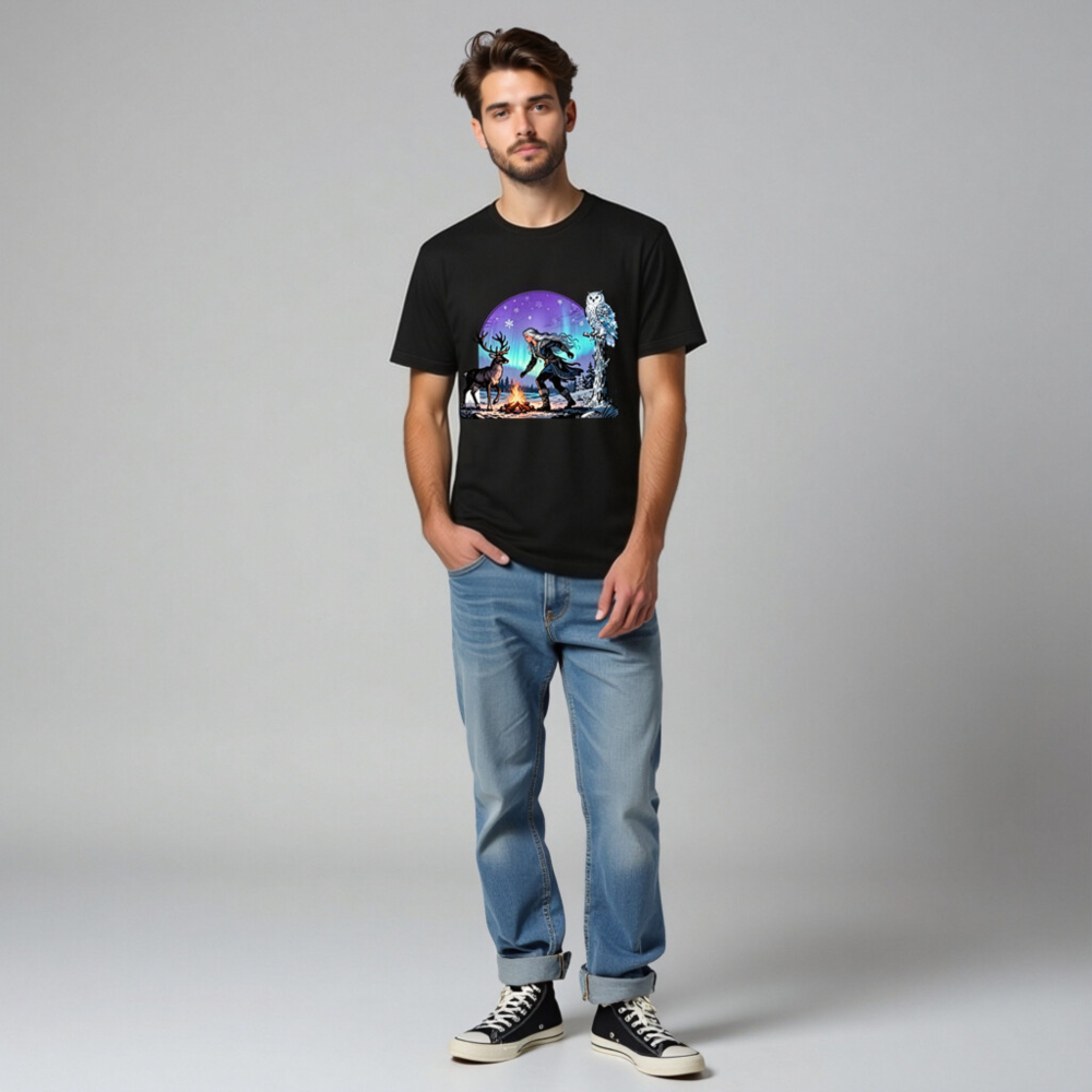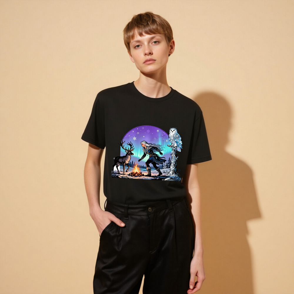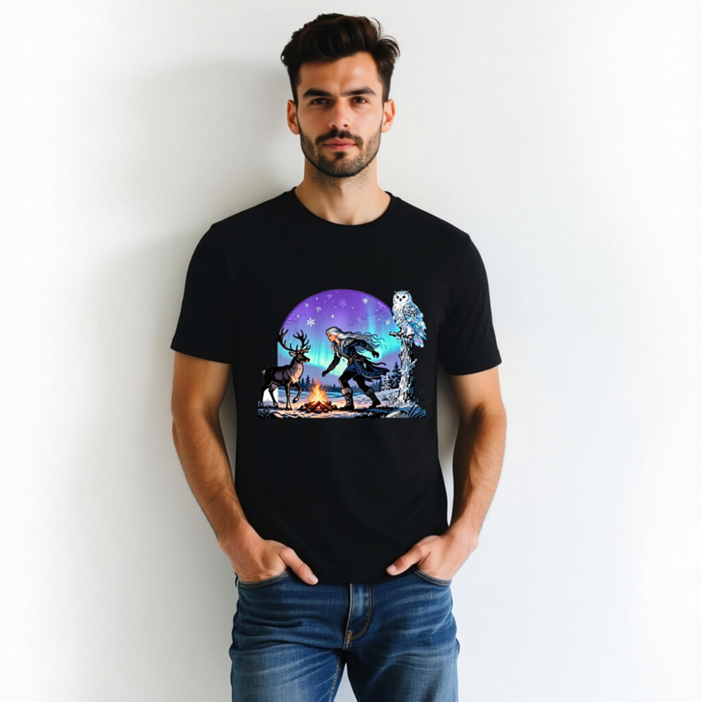 This unisex black staple t-shirt features a captivating winter scene: a silver-haired figure by a campfire, a majestic stag, and a snowy owl perched on an ice-covered tree. The vibrant aurora backdrop with falling snow enhances the magical forest vibe. Crafted for comfort and style, this versatile tee suits casual wear year-round. Ideal for nature lovers and fantasy enthusiasts seeking cozy, artistic apparel.