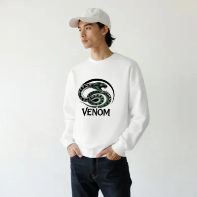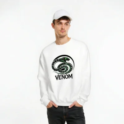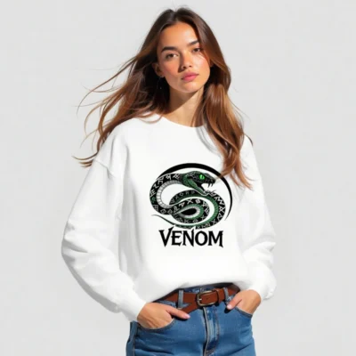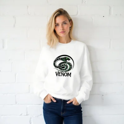 Wear the iconic Venom snake design: a coiled green serpent with glowing eyes and rune-patterned scales, encircled by a bold black arc. This unisex crew neck sweatshirt features premium soft cotton blend fabric for comfort. The striking ‘VENOM’ text below enhances its bold aesthetic. Perfect for fans of dark fantasy, comics, or edgy streetwear. Machine washable, true to size, and designed for everyday wear.