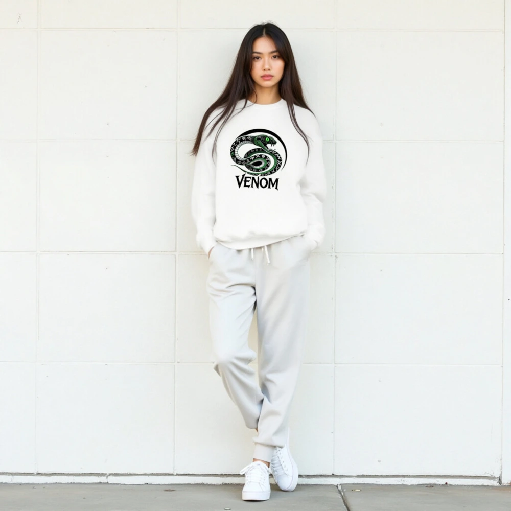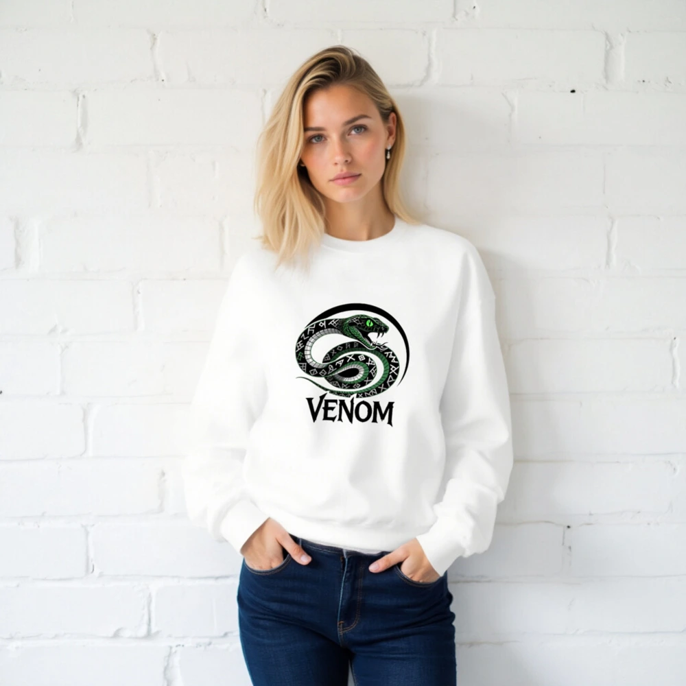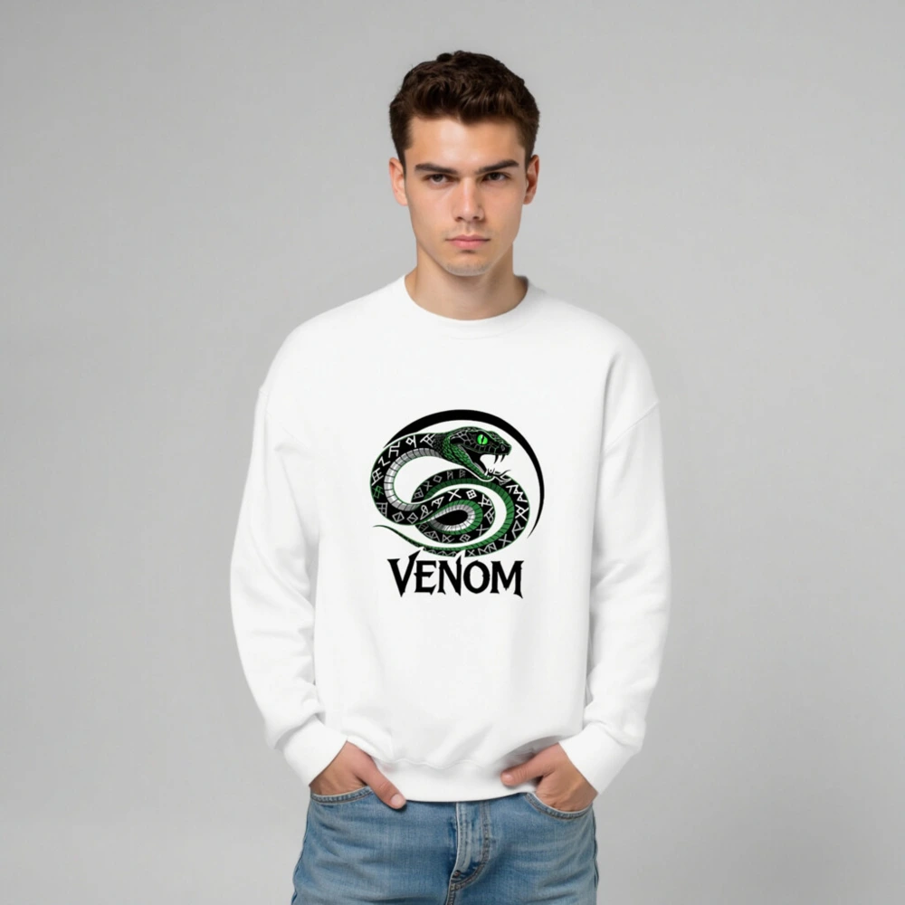 Wear the iconic Venom snake design: a coiled green serpent with glowing eyes and rune-patterned scales, encircled by a bold black arc. This unisex crew neck sweatshirt features premium soft cotton blend fabric for comfort. The striking ‘VENOM’ text below enhances its bold aesthetic. Perfect for fans of dark fantasy, comics, or edgy streetwear. Machine washable, true to size, and designed for everyday wear.