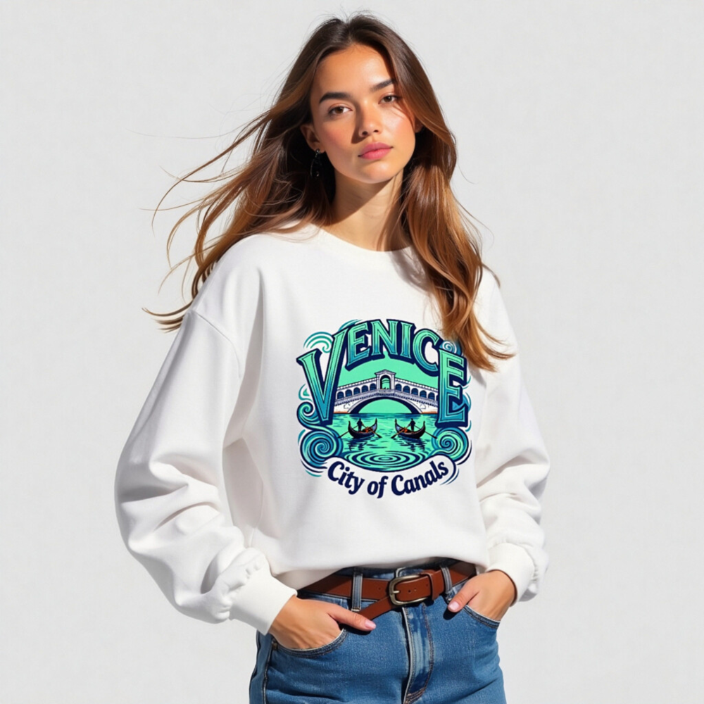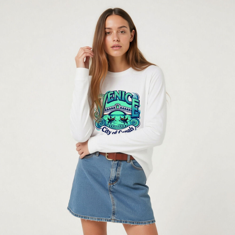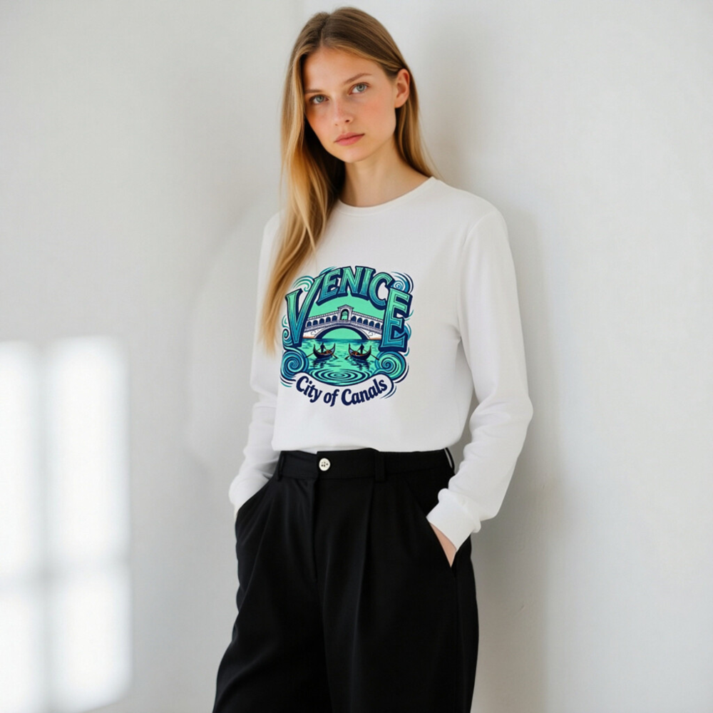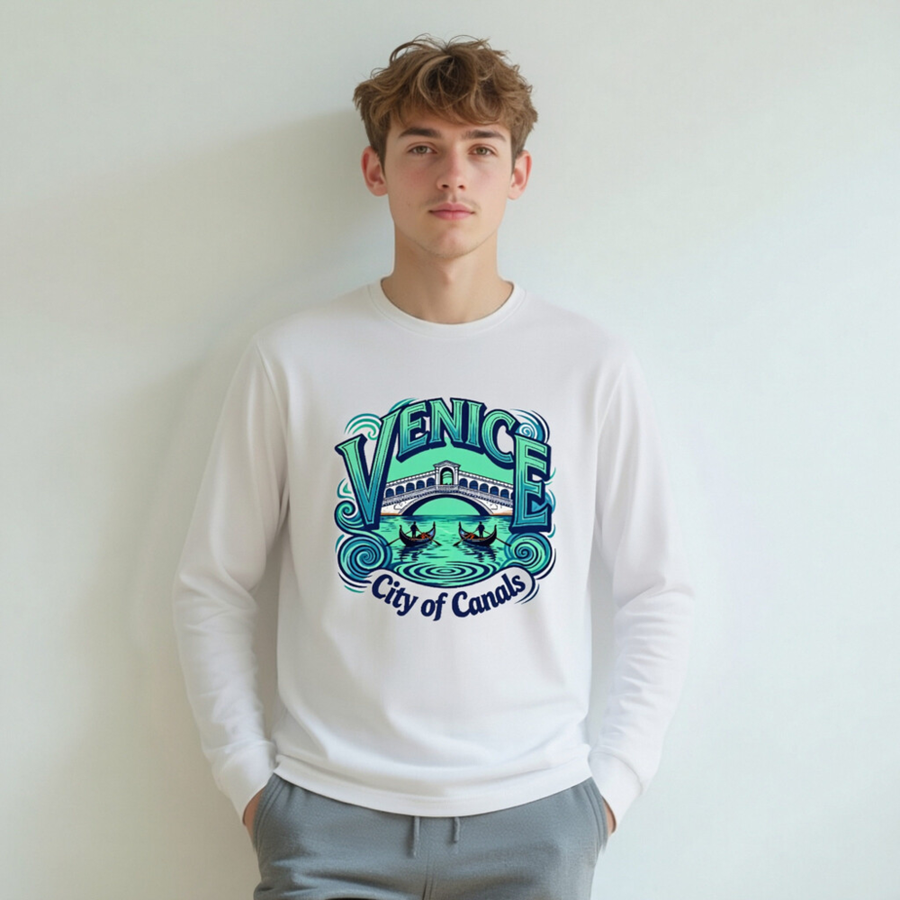 Showcase Venice’s iconic charm with this unisex long sleeve tee featuring the Rialto Bridge, gondolas, and swirling canals. Perfect for travelers and culture lovers, this comfortable cotton blend shirt captures the essence of Venice—’City of Canals’—in vibrant blue-green tones. Ideal for casual wear, gifts, or travel souvenirs. Soft, breathable, and true to size.
