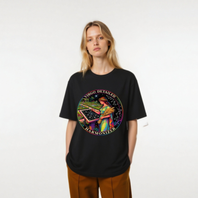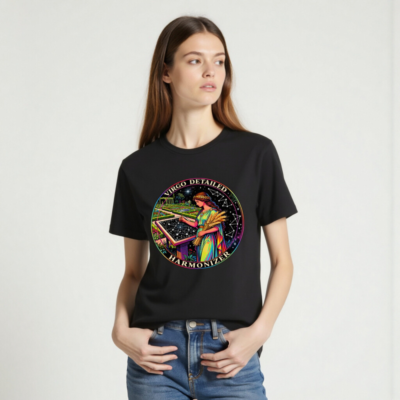 This unisex staple t-shirt features a vibrant, detailed Virgo-themed design: a rainbow-gowned goddess with wheat, sketching constellations on a star chart in a lush garden. The circular artwork includes ‘VIRGO DETAILED HARMONIZER’ text and celestial motifs. Crafted for comfort and style, it’s ideal for astrology lovers and Virgo enthusiasts seeking meaningful, artistic apparel.