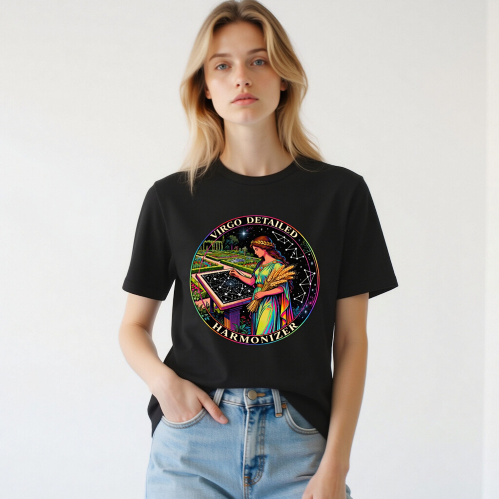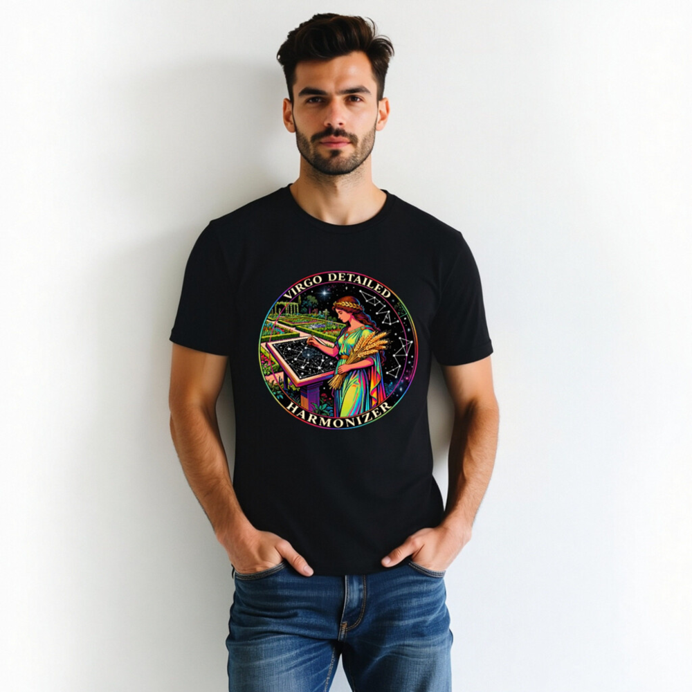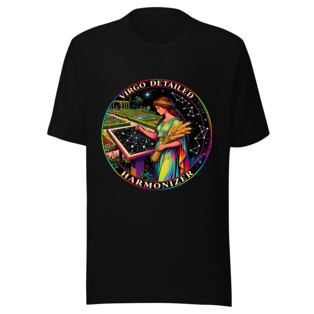 This unisex staple t-shirt features a vibrant, detailed Virgo-themed design: a rainbow-gowned goddess with wheat, sketching constellations on a star chart in a lush garden. The circular artwork includes ‘VIRGO DETAILED HARMONIZER’ text and celestial motifs. Crafted for comfort and style, it’s ideal for astrology lovers and Virgo enthusiasts seeking meaningful, artistic apparel.