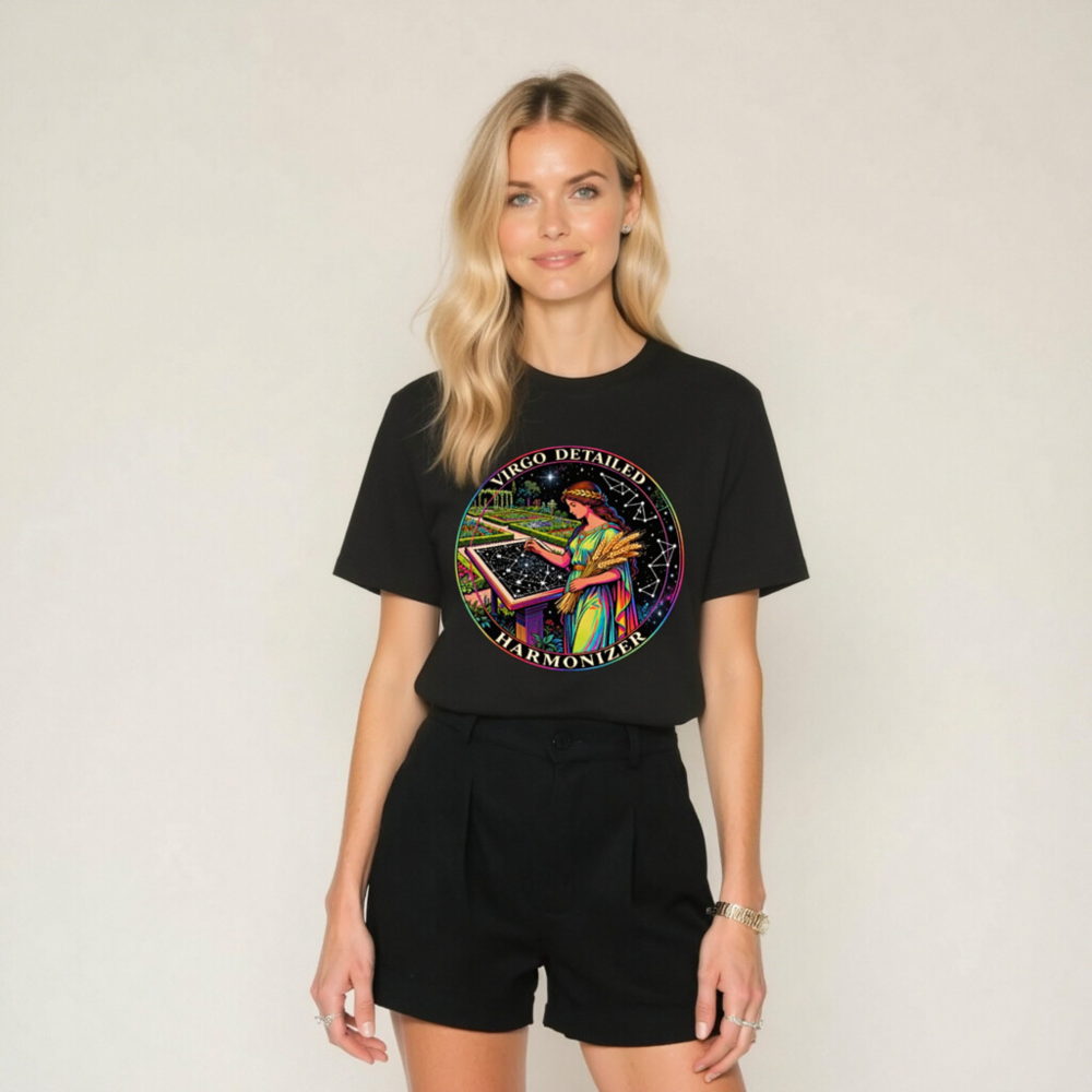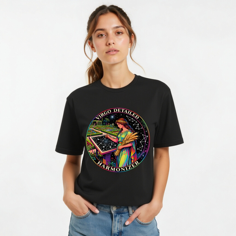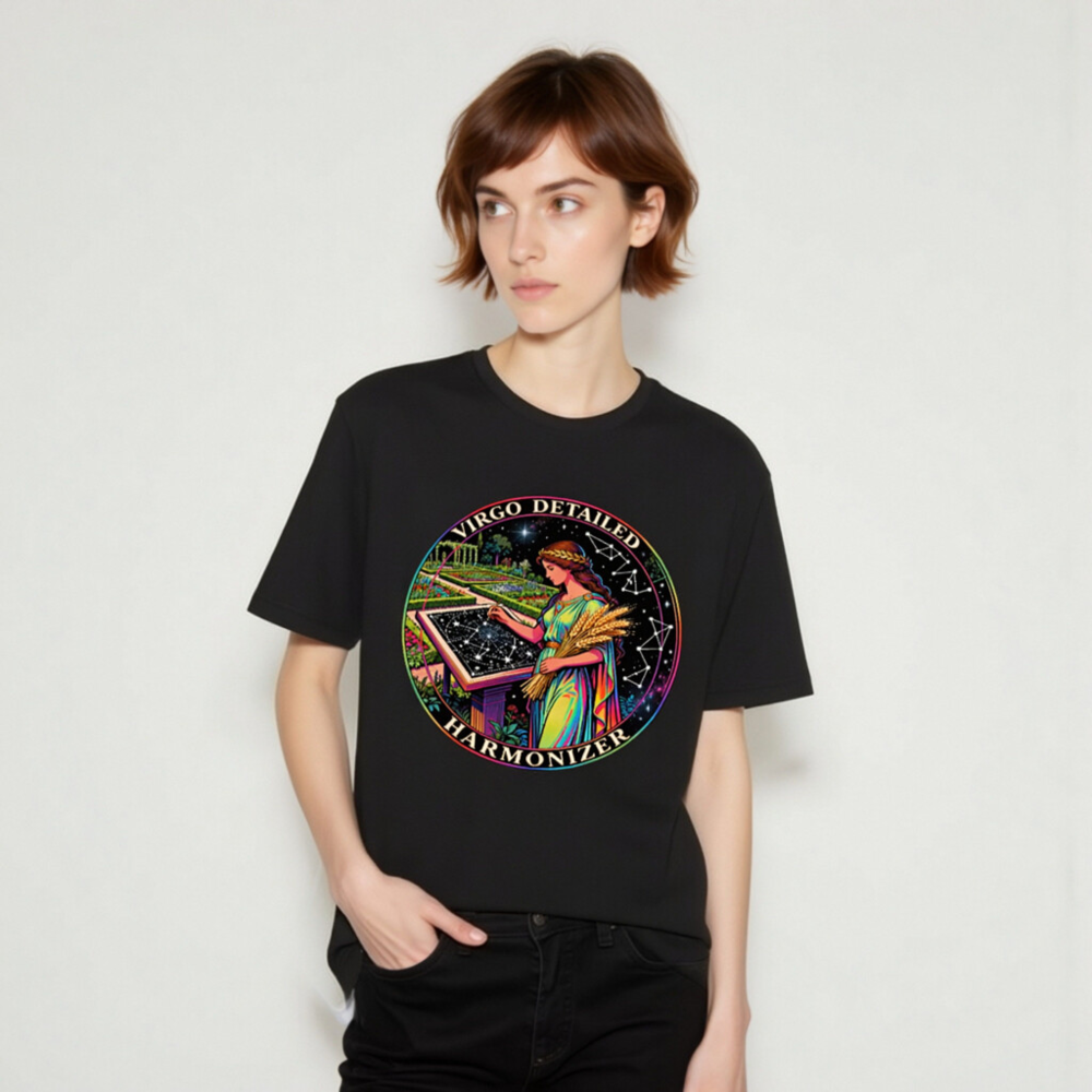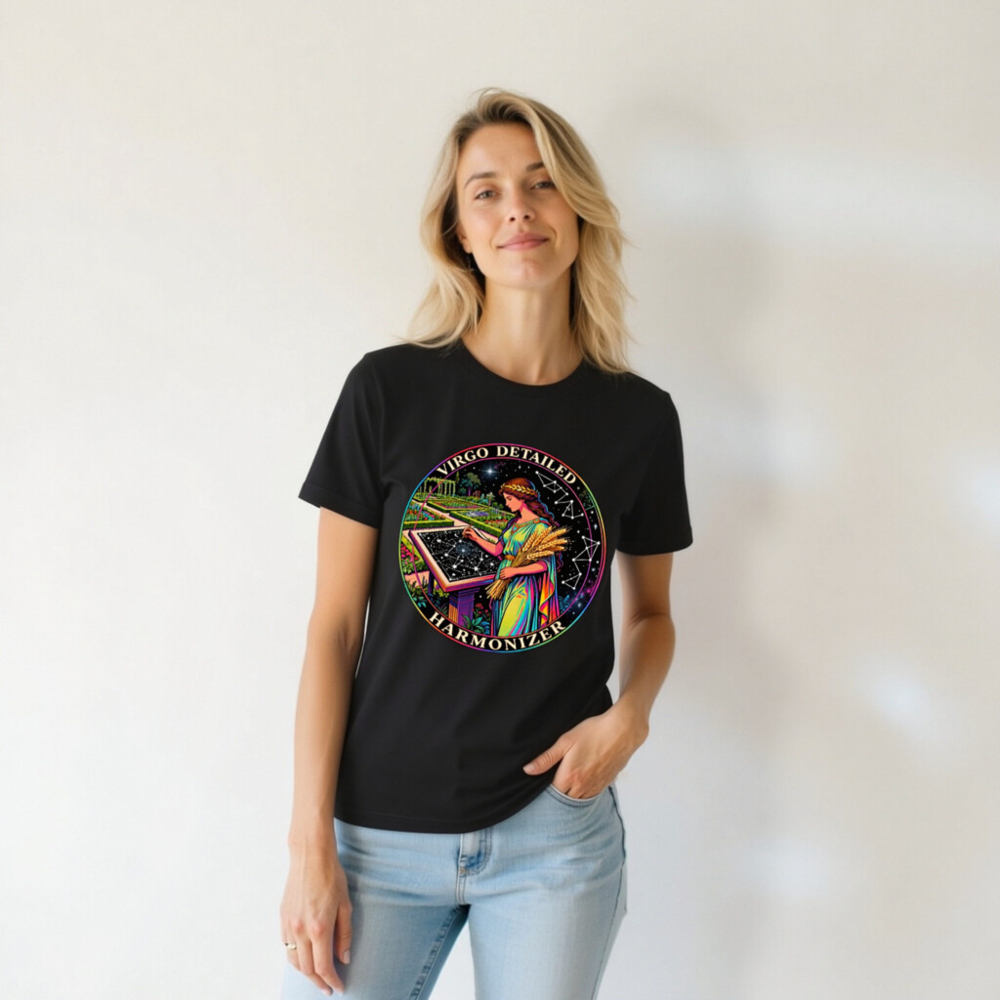 This unisex staple t-shirt features a vibrant, detailed Virgo-themed design: a rainbow-gowned goddess with wheat, sketching constellations on a star chart in a lush garden. The circular artwork includes ‘VIRGO DETAILED HARMONIZER’ text and celestial motifs. Crafted for comfort and style, it’s ideal for astrology lovers and Virgo enthusiasts seeking meaningful, artistic apparel.