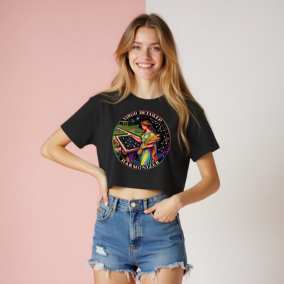 A vibrant women’s crop top featuring the Virgo zodiac theme: a rainbow-gowned goddess with wheat, star charts, and garden motifs. ‘Virgo Detailed Harmonizer’ text encircles the design. Made for astrology lovers seeking cosmic elegance—soft, stylish, and unisex fit. Perfect for daily wear or celestial events.