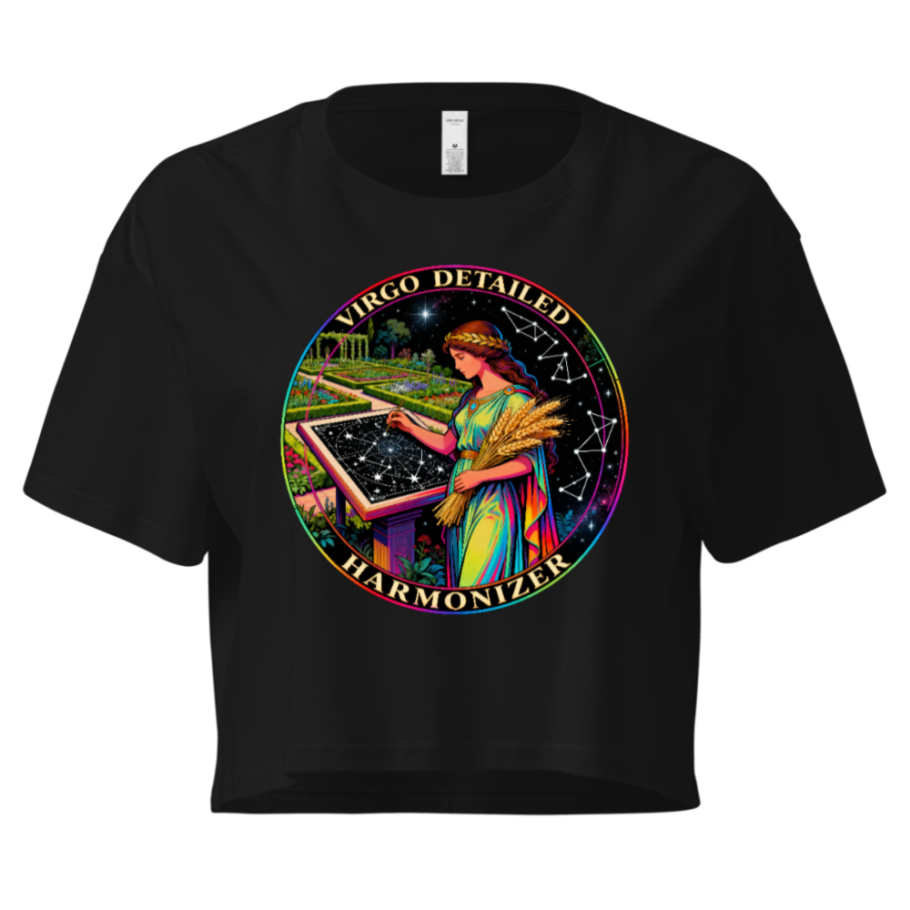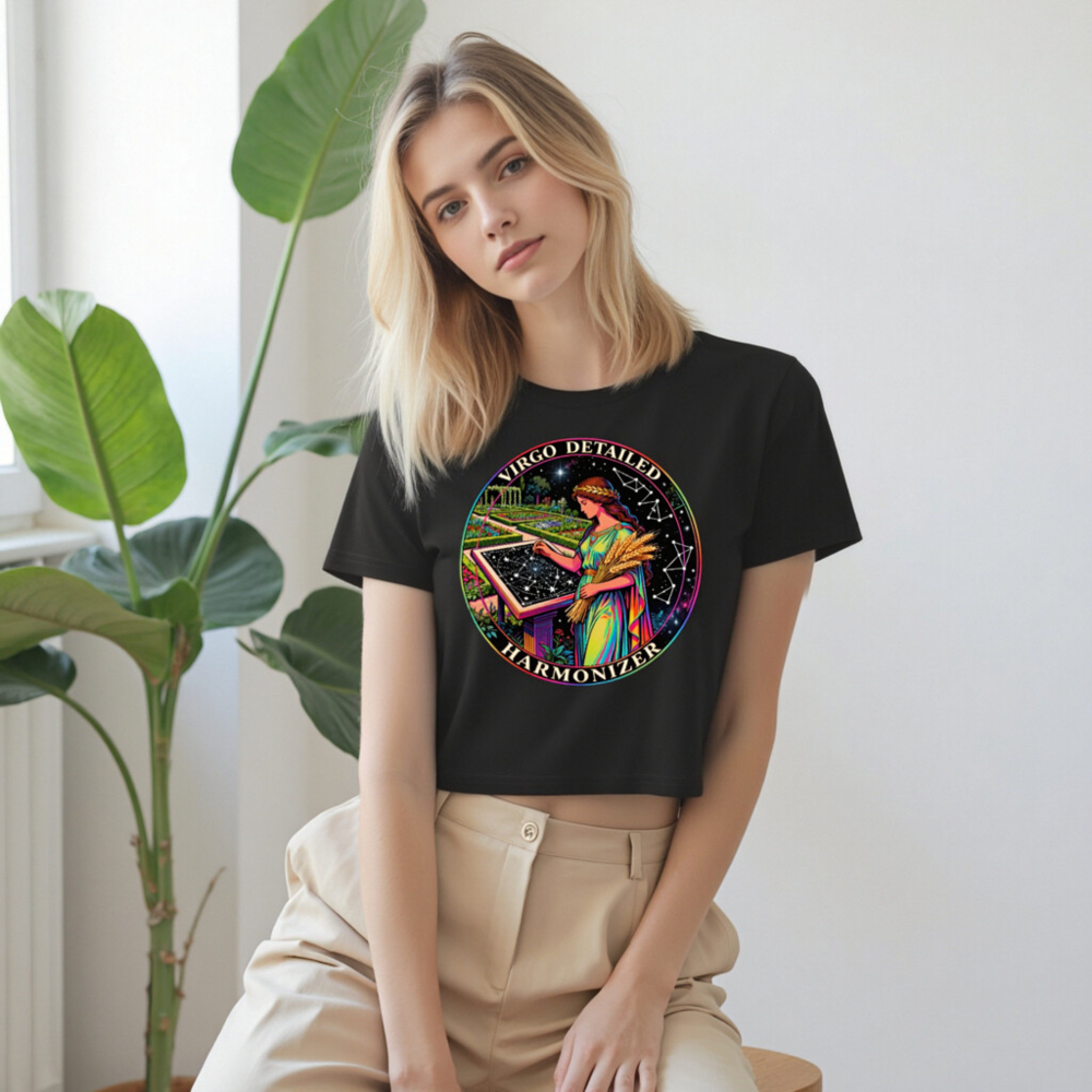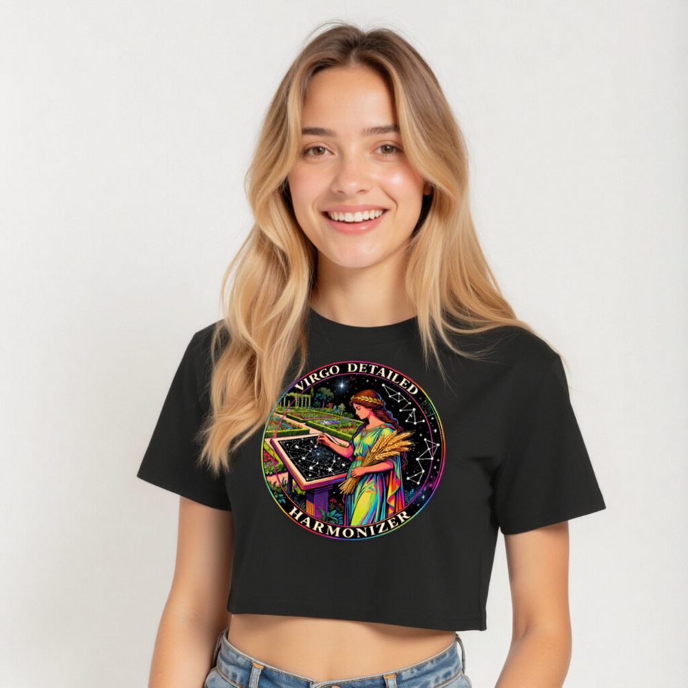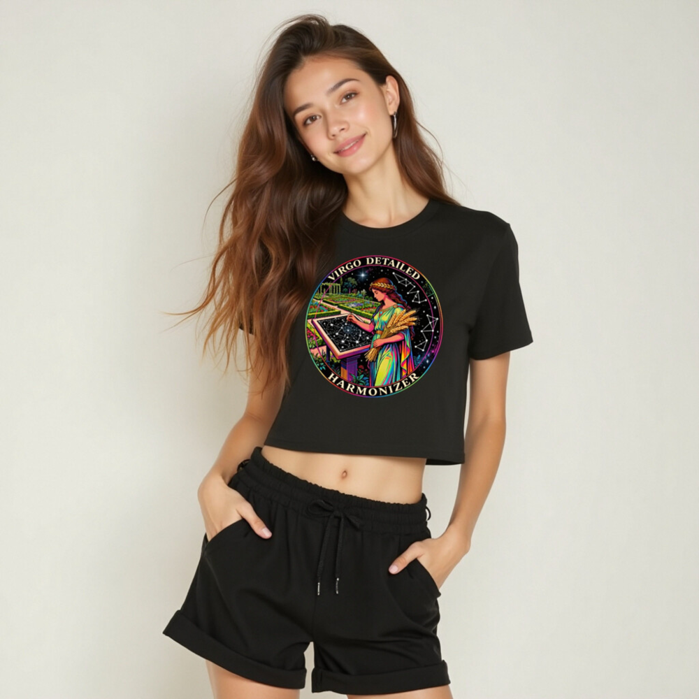 A vibrant women’s crop top featuring the Virgo zodiac theme: a rainbow-gowned goddess with wheat, star charts, and garden motifs. ‘Virgo Detailed Harmonizer’ text encircles the design. Made for astrology lovers seeking cosmic elegance—soft, stylish, and unisex fit. Perfect for daily wear or celestial events.