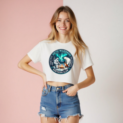This women’s crop top features a stunning Arctic wilderness design with a yeti, polar bear, and fox gathered around a campfire under the aurora borealis. The circular graphic includes ‘Arctic Wilderness’ and ‘Northern Glow’ text, evoking adventure and nature. Made for comfort and style, it’s perfect for outdoor lovers and northern lights enthusiasts. Lightweight, breathable fabric for everyday wear.