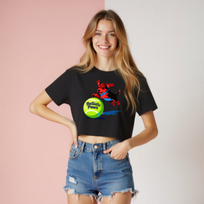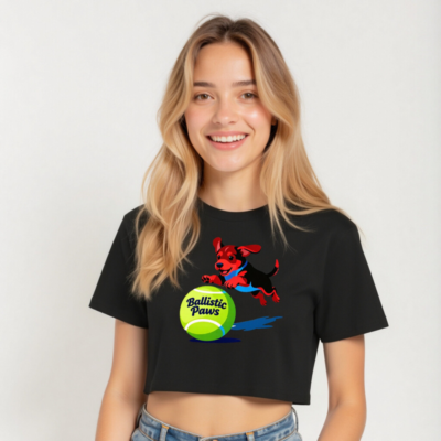 Show off your playful side with this women’s crop top featuring a vibrant cartoon puppy leaping over a tennis ball labeled ‘Ballistic Paws’. Designed for comfort and style, the short-sleeve cut fits true to size. Perfect for casual wear, pet lovers, or fitness fans seeking a fun, eye-catching look. Lightweight cotton blend for all-day ease.