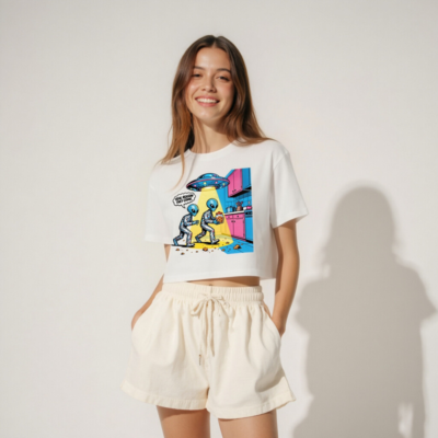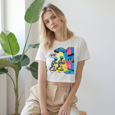 This women’s crop top features a vibrant, retro-futuristic alien scene: two blue aliens steal cookies from a kitchen under a UFO beam, with the witty caption ‘REAL REASON THEY COME.’ Designed for casual wear, this short-sleeve tee combines humor and pop culture. Made with standard cotton blend (no certifications claimed), it fits true to size and offers a trendy, cropped silhouette perfect for layering or solo styling.