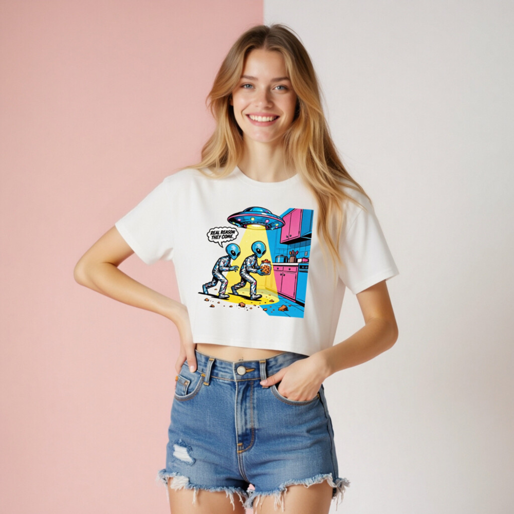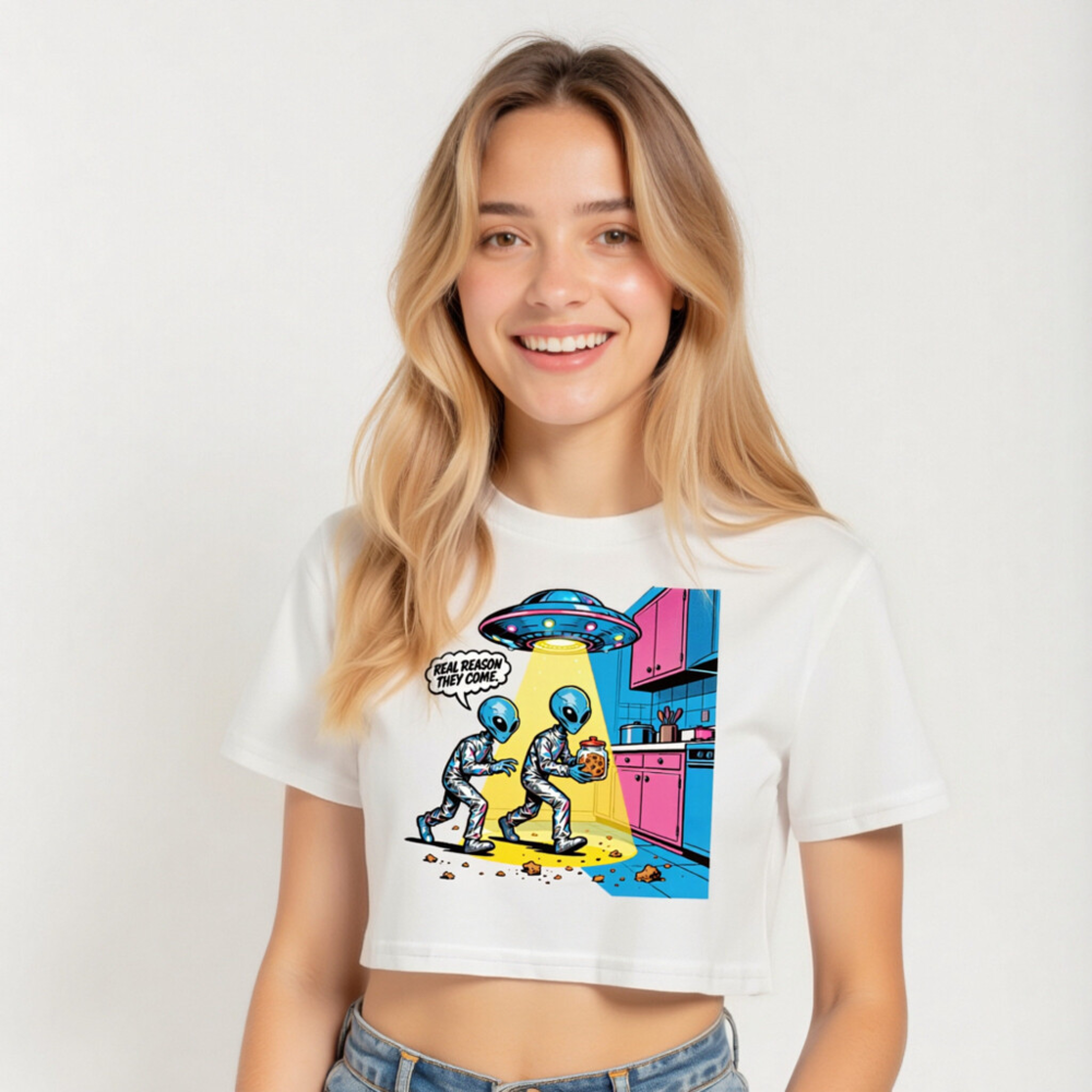 Women’s Crop Top – Alien Cookie Theft Graphic Tee, Real Reason They Come