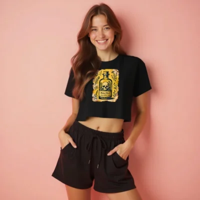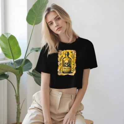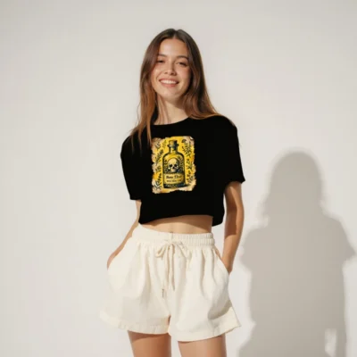 This women’s crop top features a striking vintage-style illustration of a potion bottle with a skull and herbs, labeled ‘Bone Elixir — Pick Your Cure’ on aged parchment. The design blends gothic, herbal, and apothecary aesthetics for a bold statement piece. Made from soft, comfortable fabric—ideal for casual wear or themed events. Perfect for fans of dark academia, witchy fashion, or vintage alchemy. Short, fitted silhouette with classic crew neck.