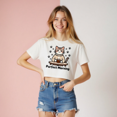 Adorable women’s crop top featuring a cozy tabby cat in a knitted sweater, sipping steaming coffee at a tiny table—surrounded by paw prints. The playful ‘Purfect Morning’ slogan adds charm. Made with soft, comfortable fabric for everyday wear. Perfect for cat lovers seeking fun, casual style. Ideal gift for coffee & cat enthusiasts. Available in standard sizing.