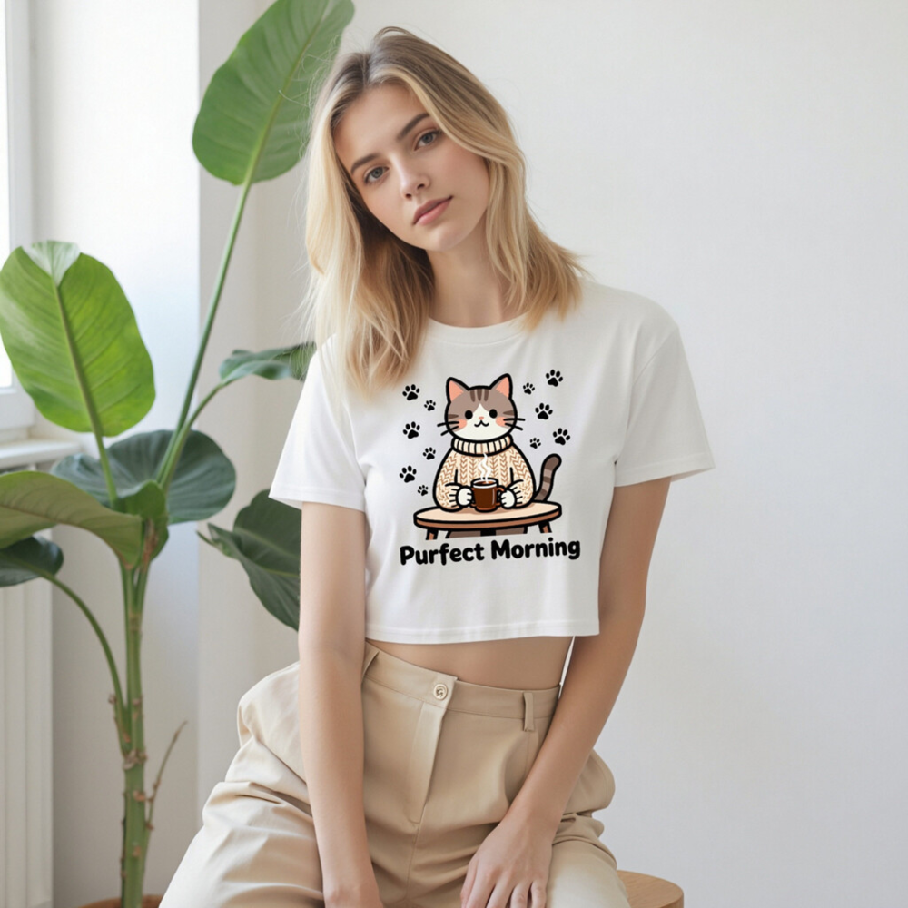 Adorable women’s crop top featuring a cozy tabby cat in a knitted sweater, sipping steaming coffee at a tiny table—surrounded by paw prints. The playful ‘Purfect Morning’ slogan adds charm. Made with soft, comfortable fabric for everyday wear. Perfect for cat lovers seeking fun, casual style. Ideal gift for coffee & cat enthusiasts. Available in standard sizing.