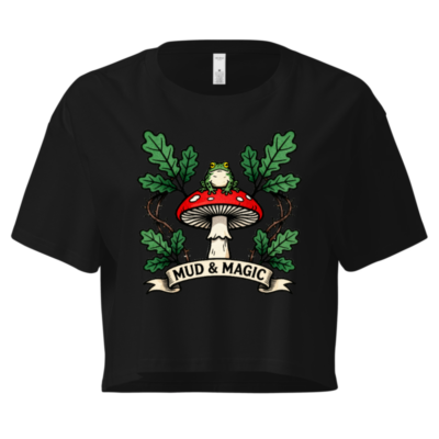 A women’s black crop top featuring a whimsical illustration of a green frog perched atop a red-and-white mushroom, surrounded by oak leaves and vines. The design includes a vintage-style banner reading ‘MUD & MAGIC’. Perfect for nature lovers and fantasy enthusiasts. Made with comfortable, everyday wear fabric.