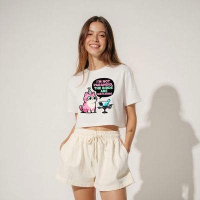 This women’s crop top features a playful pink cat wearing a party hat beside a pixel-art drone with a bird-shaped camera. The bold speech bubble reads: ‘I’m Not Paranoid, The Birds Are Watching’—a witty nod to surveillance humor and pop culture. Designed for casual wear, this short-sleeve tee combines humor, retro gaming aesthetics, and cozy fit. Ideal for cat lovers, tech enthusiasts, and fans of clever wordplay. Made from soft, breathable fabric for everyday comfort.