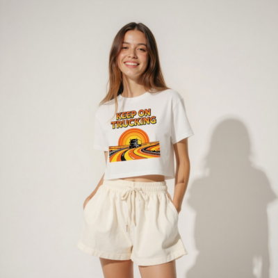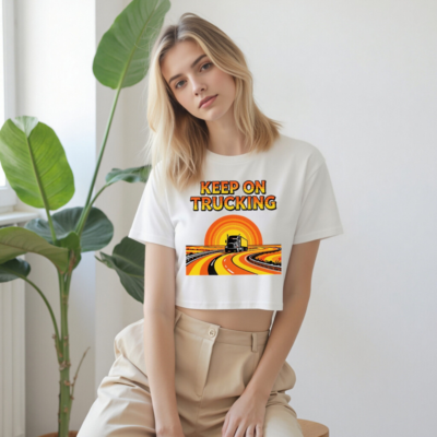 Show your love for the road with this women’s crop top featuring a bold ‘KEEP ON TRUCKING’ vintage-style graphic. The retro sunset highway design with a classic semi-truck makes it perfect for truckers, drivers, and road trip lovers. Short sleeve, relaxed fit, white base—ideal for casual wear. Comfortable cotton blend, machine washable.