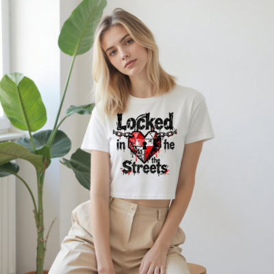 This women’s crop top features a bold graphic design with a red-and-black heart, keyhole, and chain motif, paired with the edgy text ‘Locked in the Streets’. Made from soft, breathable fabric for everyday comfort. Perfect for streetwear lovers seeking a statement piece. Short sleeve, relaxed fit, ideal for casual outings or music events.