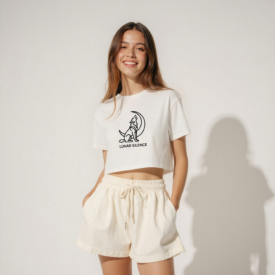 Stylish women’s crop top featuring a minimalist black line-art wolf howling at the crescent moon, symbolizing ‘Lunar Silence’. Soft cotton blend, relaxed fit with short sleeves and rounded neckline. Ideal for casual wear or spiritual fashion lovers. Designed for comfort and bold self-expression.