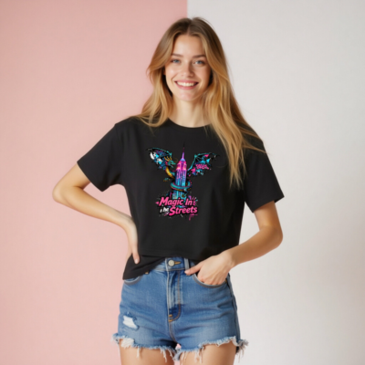 Vibrant women’s crop top featuring a neon dragon coiled around the Empire State Building, blending urban street art with fantasy. Bold ‘Magic In The Streets’ graphic in pink/magenta and cyan. High-quality soft cotton blend, cropped hem for modern fit. Perfect for fans of NYC magic, streetwear, and mythical aesthetics. Ideal gift for urban fantasy lovers.