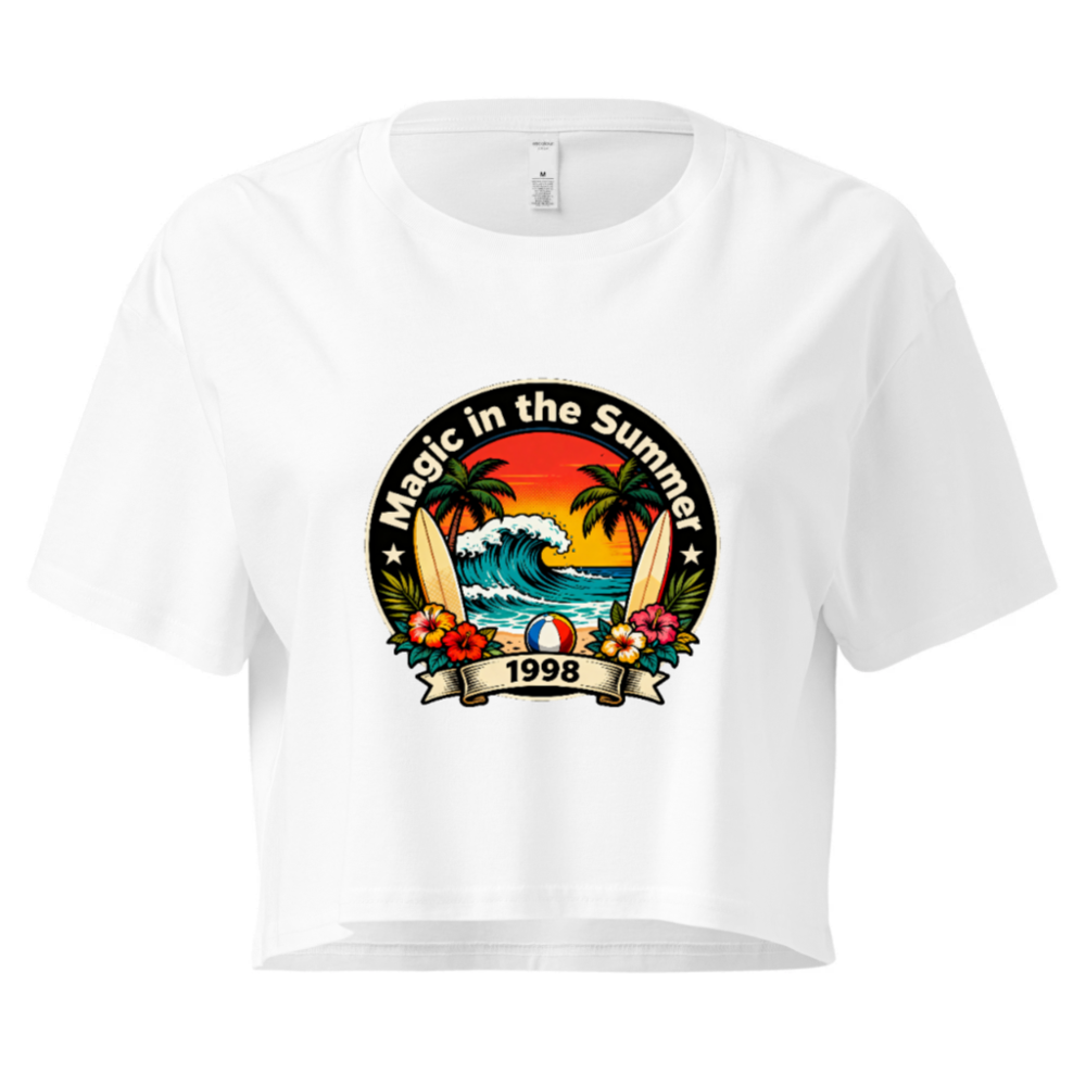 Celebrate summer vibes with this women’s crop top featuring a vibrant retro beach scene: sunset, waves, palm trees, surfboards, hibiscus flowers, and a beach ball. ‘Magic in the Summer 1998’ text evokes nostalgic 90s coastal charm. Soft cotton blend, relaxed fit, perfect for casual wear or vacation. Ideal for beach lovers seeking vintage-inspired style.