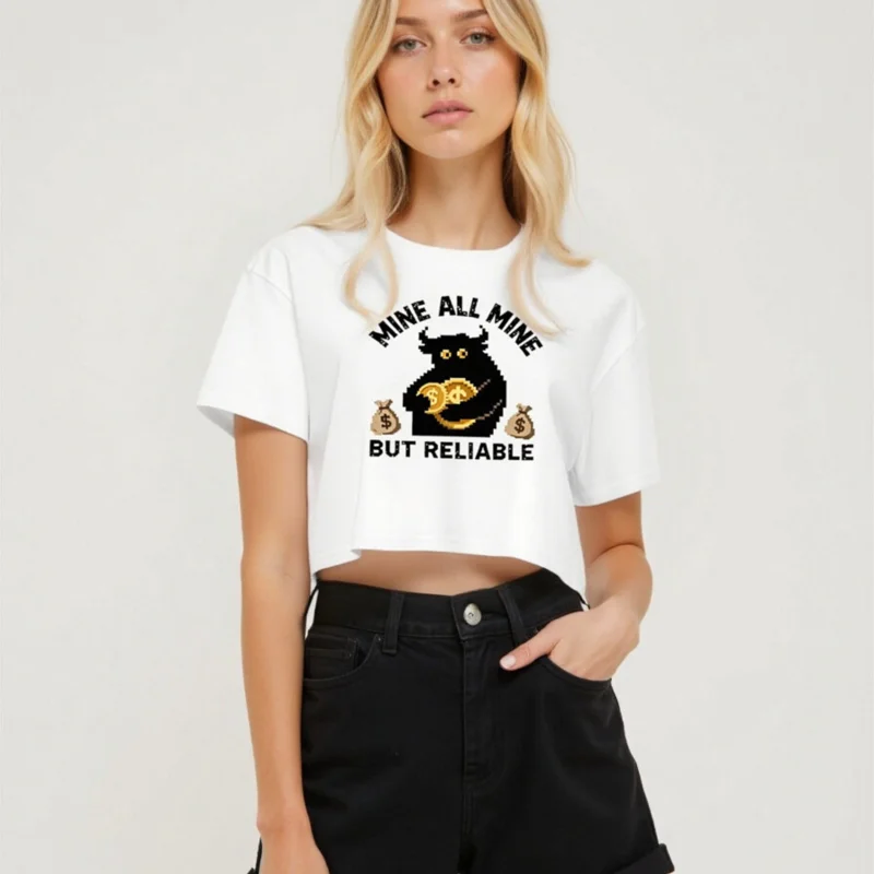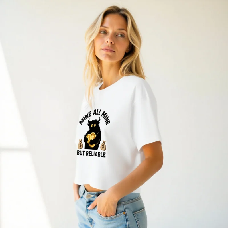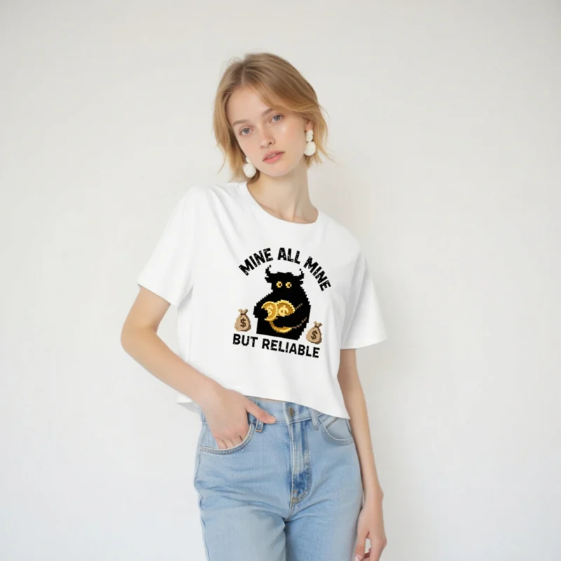 Show off your mining spirit with this women’s crop top featuring a pixel-art black cow holding gold coins, flanked by money bags. The playful ‘Mine All Mine But Reliable’ slogan adds humor and charm. Made for comfort and style—perfect for crypto fans, gamers, or anyone who loves retro digital aesthetics. Soft cotton blend, casual fit, cropped hem for a trendy look.