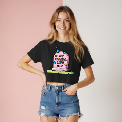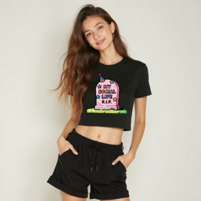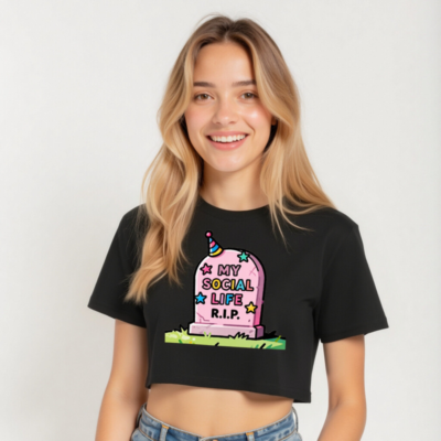 This women’s crop top features a playful, cartoon-style pink tombstone with ‘MY SOCIAL LIFE R.I.P.’ in colorful letters, topped with a party hat and stars—perfect for expressing humor about social fatigue. Short, trendy fit with soft cotton blend. Ideal for casual wear, comedy fans, or anyone who’s had enough of the hustle. Designed for comfort and bold self-expression.
