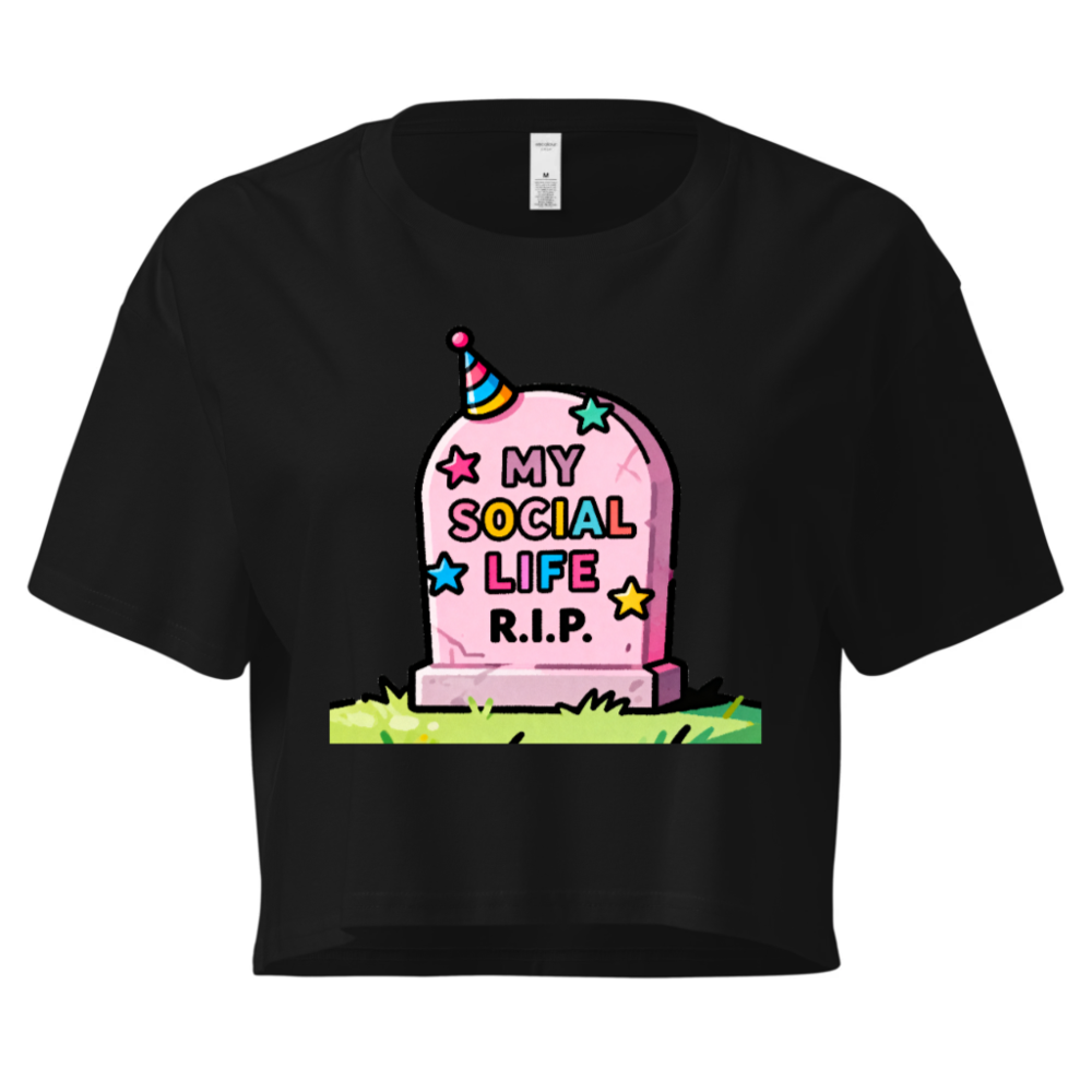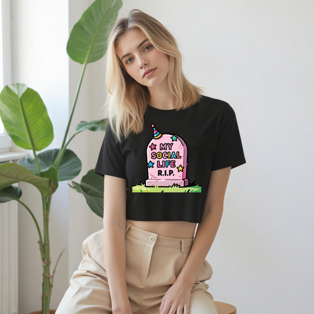 This women’s crop top features a playful, cartoon-style pink tombstone with ‘MY SOCIAL LIFE R.I.P.’ in colorful letters, topped with a party hat and stars—perfect for expressing humor about social fatigue. Short, trendy fit with soft cotton blend. Ideal for casual wear, comedy fans, or anyone who’s had enough of the hustle. Designed for comfort and bold self-expression.