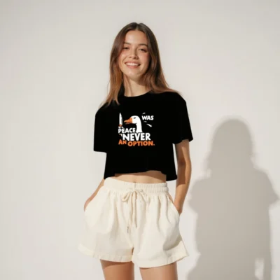 Bold women’s crop top featuring a striking goose holding a knife with the iconic phrase ‘Peace Never Was an Option’ in white and orange. Designed for confident, edgy style—short sleeve, relaxed fit, black base. Perfect for statement-making casual wear. Ideal for fans of bold graphic tees with a strong visual message.