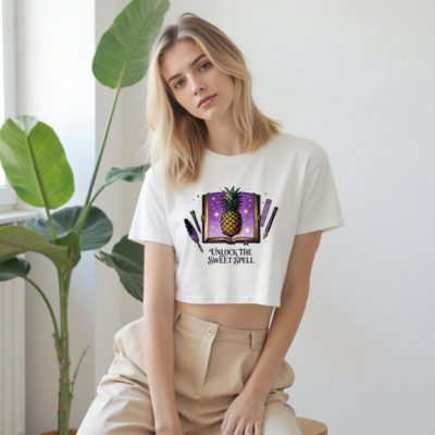 This women’s crop top features a magical pineapple nestled in an open spellbook with starry purple pages, flanked by quill pens and a scroll. The playful phrase ‘Unlock the Sweet Spell’ adds whimsy to this fantasy-themed tee. Soft cotton blend, stylish cropped fit—perfect for spellcasters and pineapple lovers alike. Ideal for casual wear, festivals, or as a unique gift. Designed for comfort and charm.