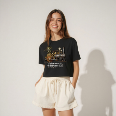 Featuring a vibrant steampunk pineapple train design, this women’s crop top blends tropical charm with industrial aesthetics. Made from premium soft fabric for comfort and durability, it’s perfect for casual wear or themed events. The bold ‘Powered by Tropics’ slogan adds playful flair. Ideal for pineapple lovers and steampunk enthusiasts seeking unique fashion.