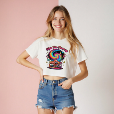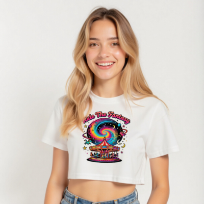 This vibrant women’s crop top features a whimsical ‘Ride The Fantasy’ design: a colorful carousel with unicorns and dragons set against a swirling galaxy backdrop. Made from soft, comfortable fabric, it’s perfect for casual wear or fantasy-themed events. The short sleeve, cropped fit offers modern style and ease of movement. Ideal for fans of cosmic, magical aesthetics—no extra embellishments, just pure visual joy.
