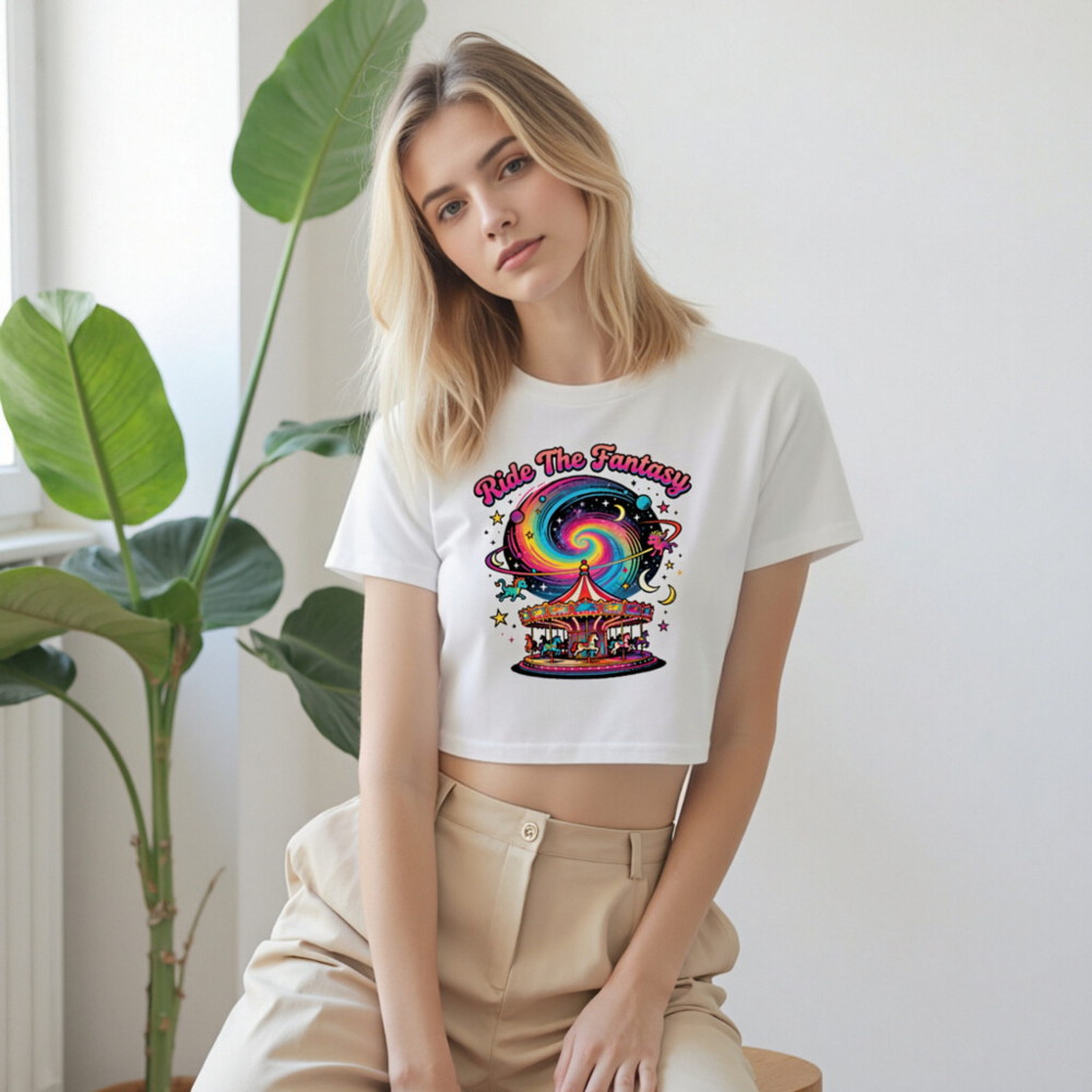 This vibrant women’s crop top features a whimsical ‘Ride The Fantasy’ design: a colorful carousel with unicorns and dragons set against a swirling galaxy backdrop. Made from soft, comfortable fabric, it’s perfect for casual wear or fantasy-themed events. The short sleeve, cropped fit offers modern style and ease of movement. Ideal for fans of cosmic, magical aesthetics—no extra embellishments, just pure visual joy.