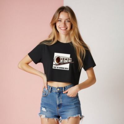 This women’s crop top features a playful ‘Ride the Morning Brew’ design: a coffee cup transformed into a train on tracks, perfect for coffee lovers. Made from soft, comfortable fabric, it’s ideal for casual wear or morning routines. The bold graphic and witty slogan combine style with humor—no caffeine required to feel energized. Designed for everyday comfort and fun.