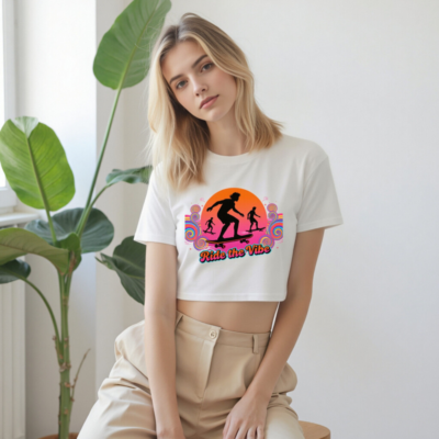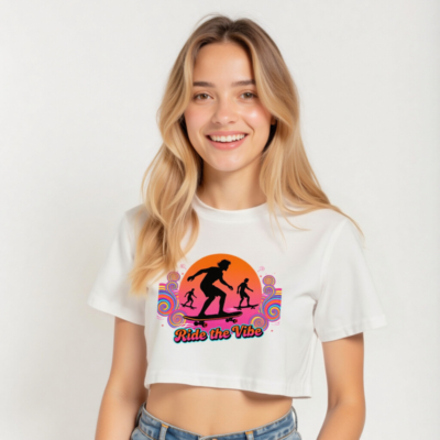 Vibrant retro-style women’s crop top featuring bold ‘Ride the Vibe’ skateboard graphic with sunset silhouettes and psychedelic swirls. Short sleeve, relaxed fit, ideal for casual wear or skate culture lovers. Comfortable cotton blend, unisex sizing available. Perfect for summer days, festivals, or everyday street style. Designed for confident self-expression.