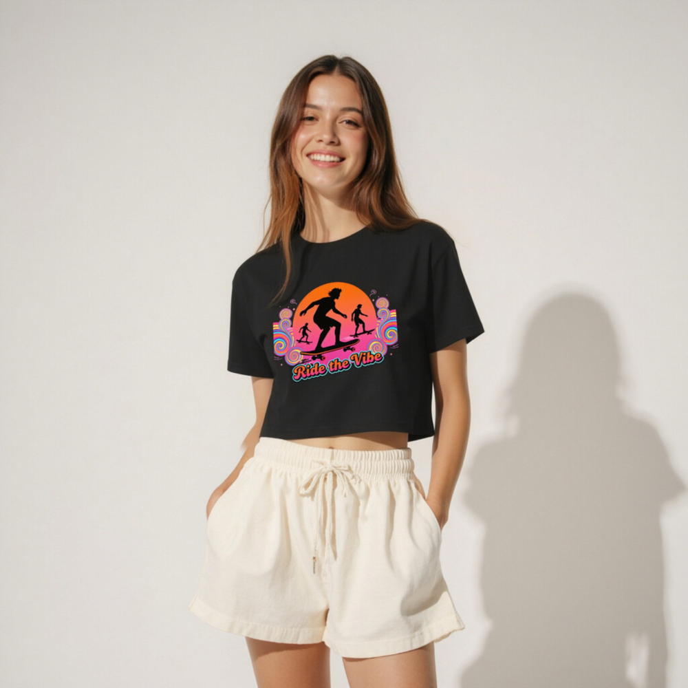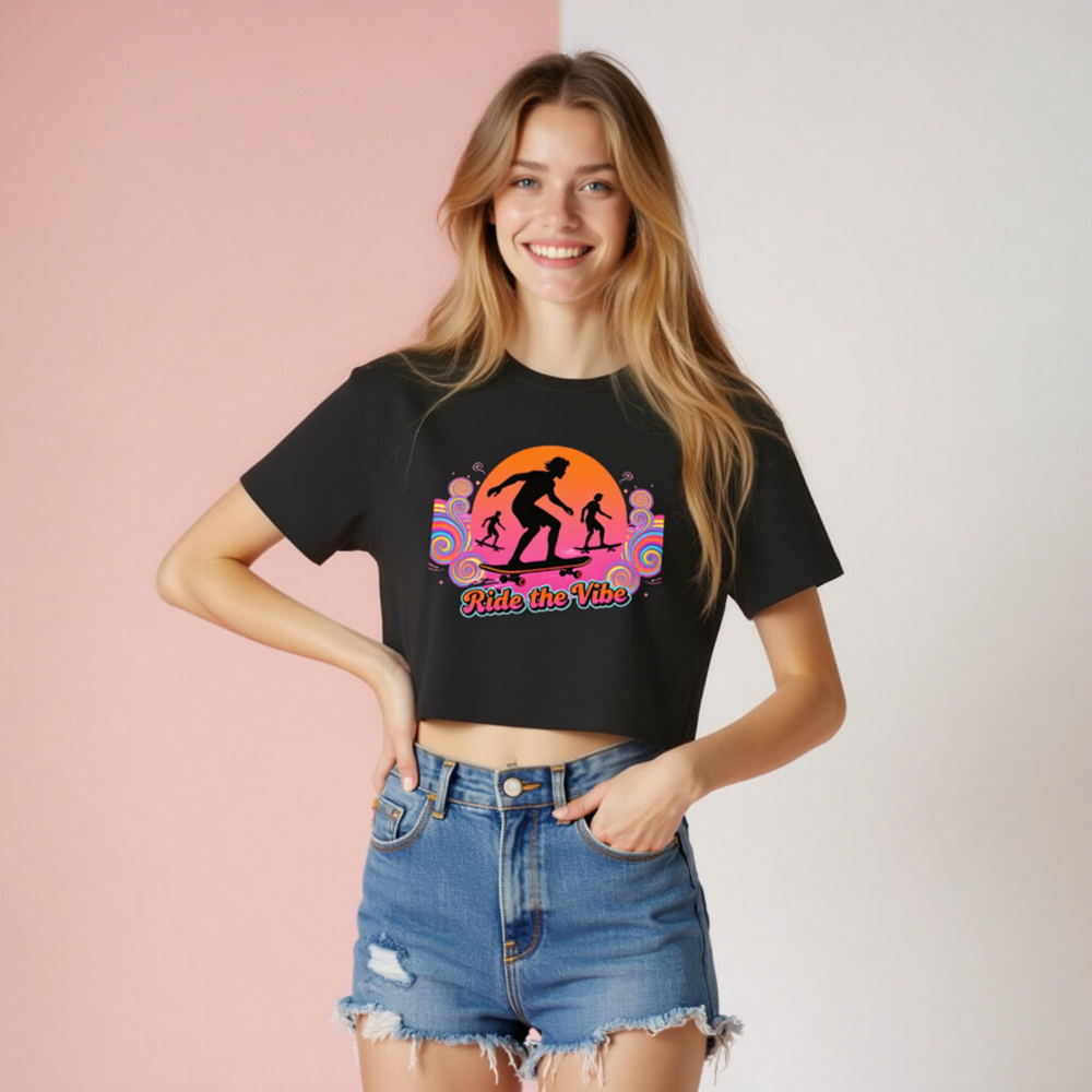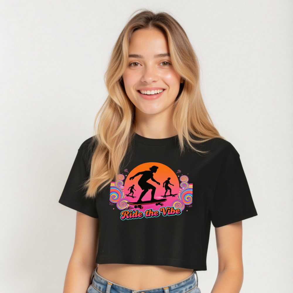 Vibrant retro-style women’s crop top featuring bold ‘Ride the Vibe’ slogan and dynamic skateboarder silhouettes against a sunset swirl background. Short sleeve, relaxed fit, ideal for casual wear or skate culture lovers. High-quality cotton blend, comfortable and durable. Perfect gift for teens & young adults who love streetwear and active lifestyles.