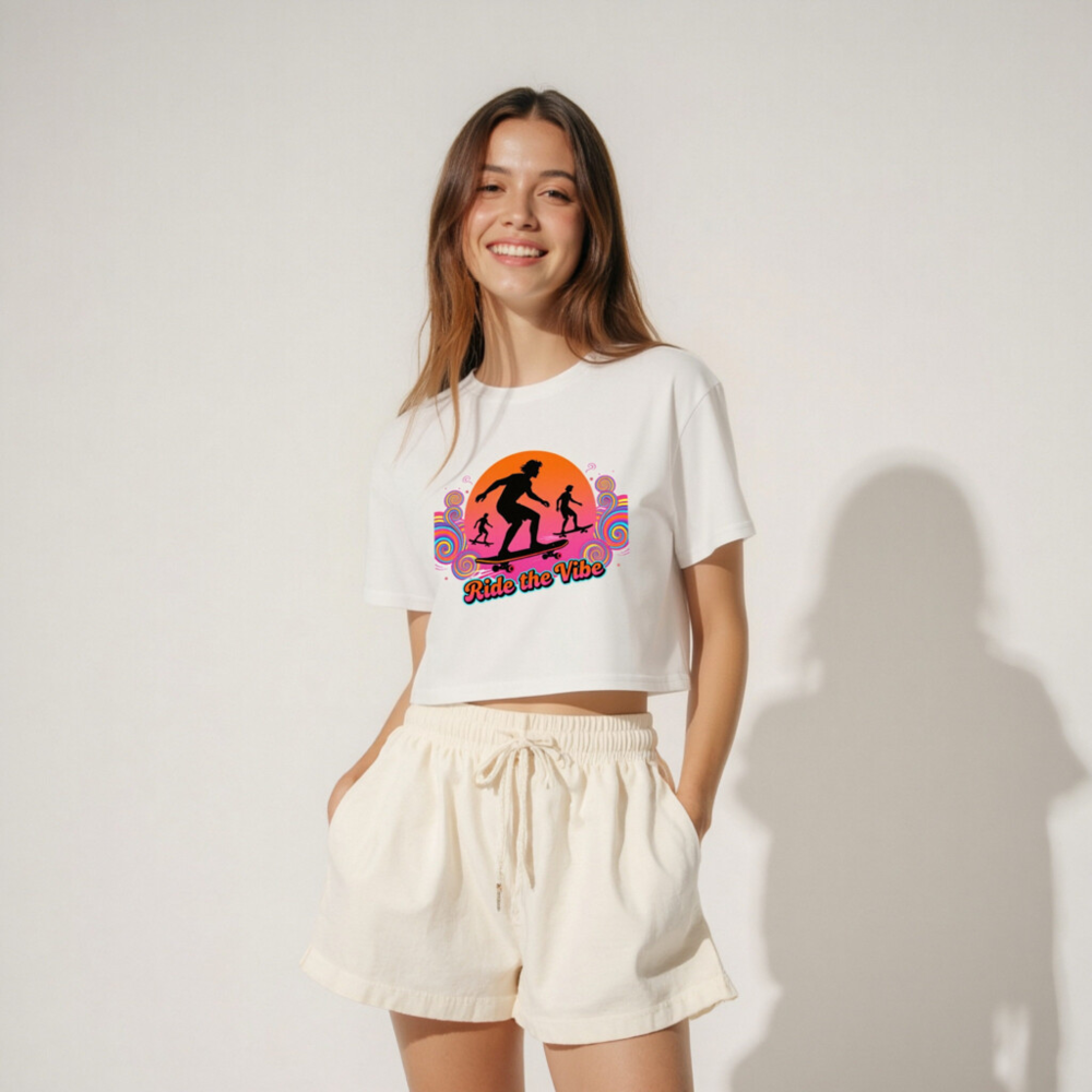 Women’s Crop Top – Ride the Vibe Skateboard Graphic Tee, Short Sleeve