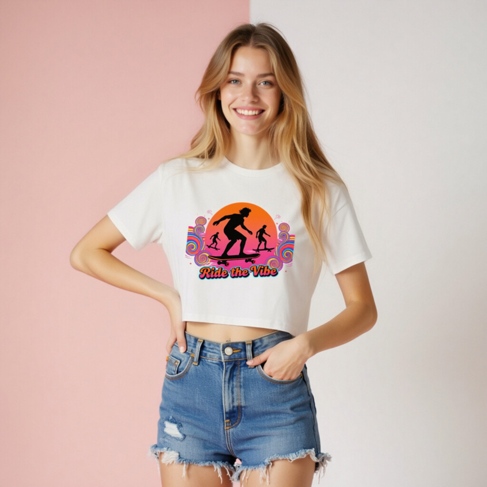 Vibrant retro-style women’s crop top featuring bold ‘Ride the Vibe’ skateboard graphic with sunset silhouettes and psychedelic swirls. Short sleeve, relaxed fit, ideal for casual wear or skate culture lovers. Comfortable cotton blend, unisex sizing available. Perfect for summer days, festivals, or everyday street style. Designed for confident self-expression.