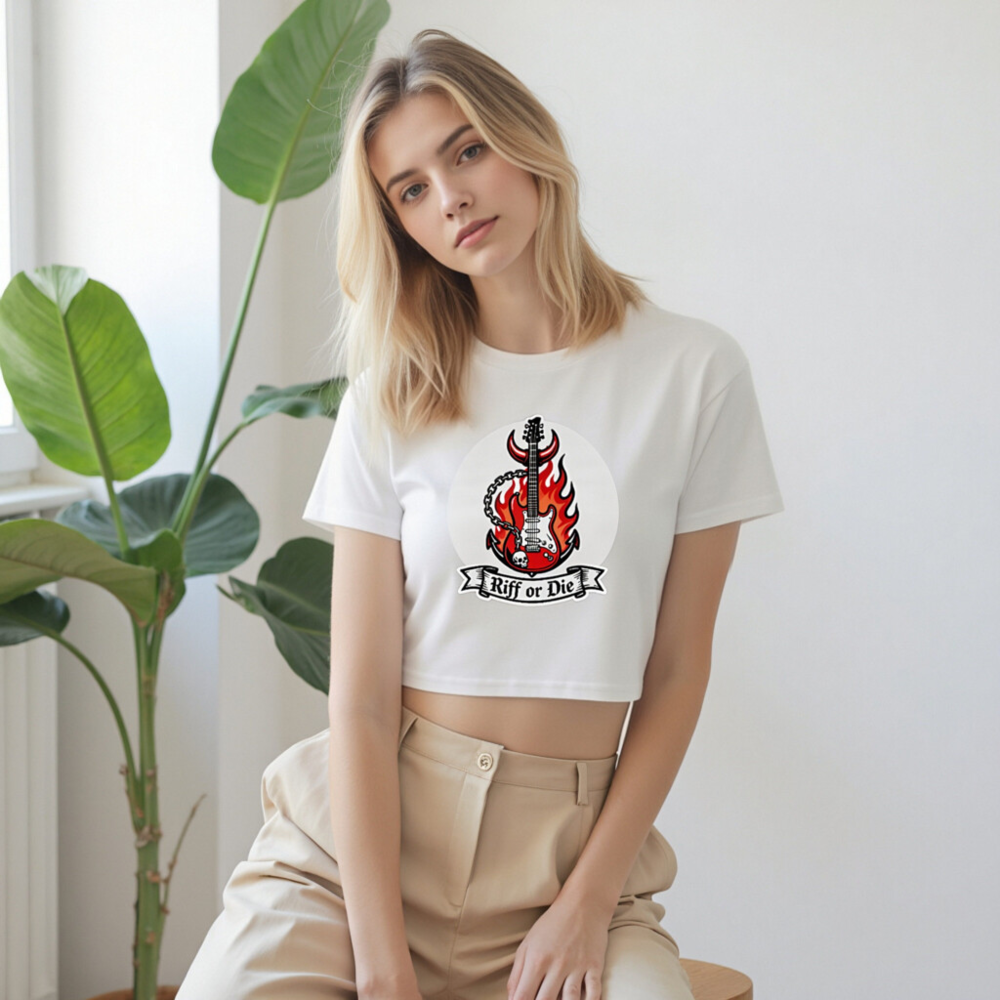 Show your rock spirit with this women’s crop top featuring a bold electric guitar engulfed in flames, adorned with devil horns, chain, and skull—perfect for music lovers. The stylish short sleeve design offers a trendy, edgy fit. ‘Riff or Die’ slogan adds attitude. Made from comfortable cotton blend. Ideal for concerts, festivals, or everyday rebellion.