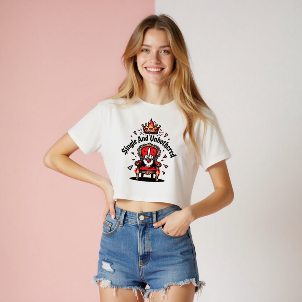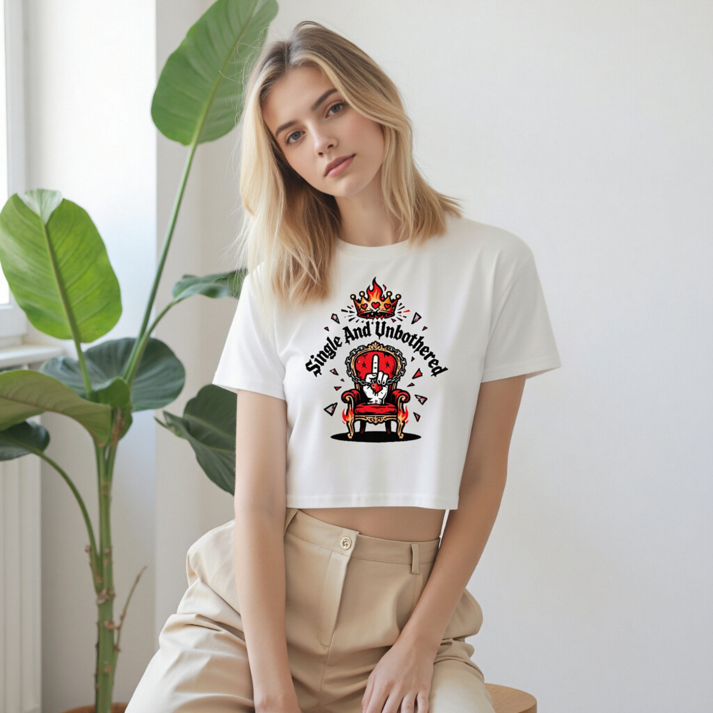 Bold women’s crop top featuring a fiery crown, regal throne, and defiant hand gesture with ‘Single And Unbothered’ text. Designed for confident self-expression—perfect for those who embrace independence. Soft cotton blend, stylish cropped fit, ideal for casual wear or statement looks. Stand out with this empowering graphic tee.