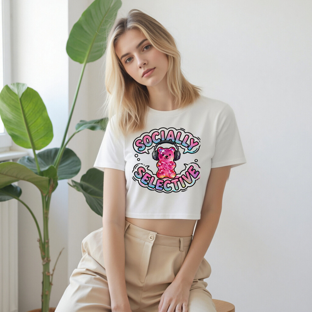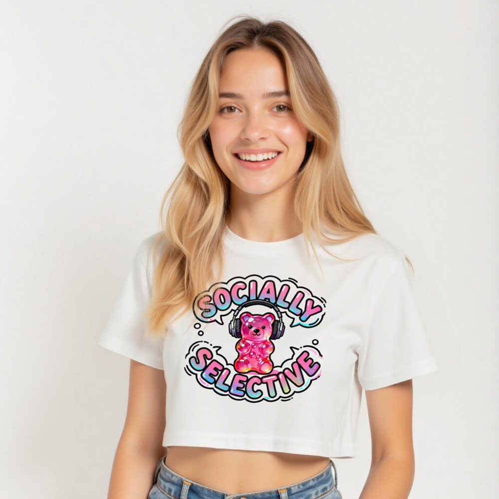 Women’s Crop Top – Socially Selective Gummy Bear with Headphones, Trendy Short Sleeve Tee