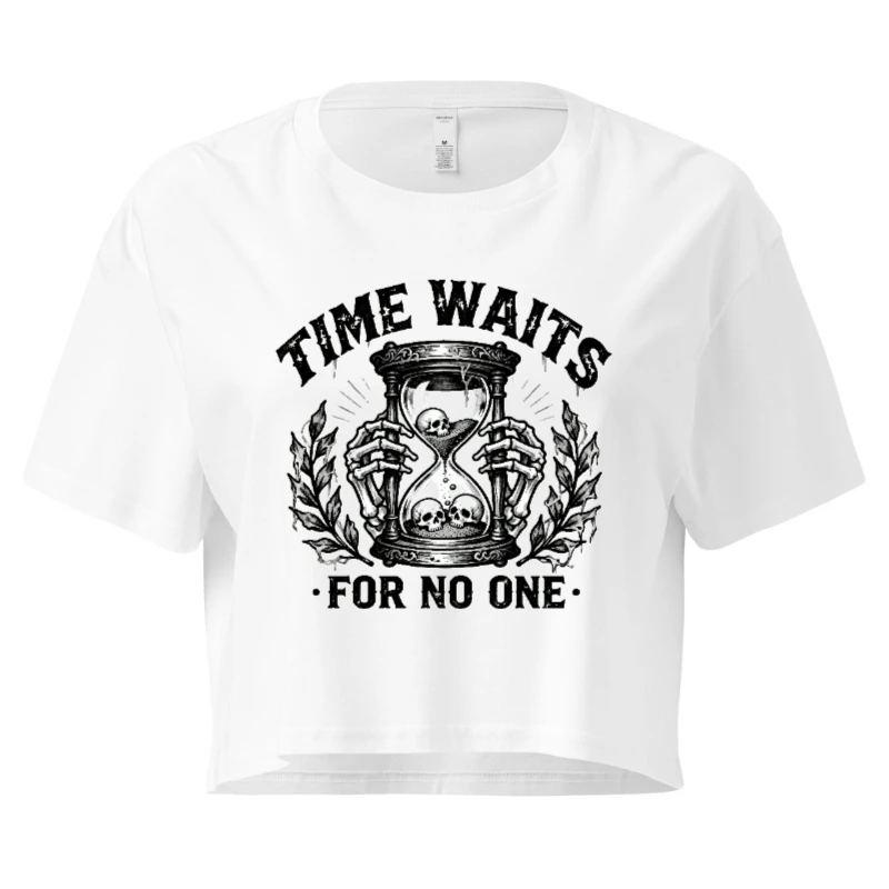 This women’s crop top features a bold black-and-white vintage-style graphic: skeletal hands holding an hourglass with skulls inside, flanked by laurel wreaths. The design embodies the phrase ‘TIME WAITS FOR NO ONE’ in distressed typography. Made from soft, comfortable fabric, it offers a trendy, edgy fit perfect for goth, alternative, or statement fashion lovers. Ideal for casual wear, festivals, or as a conversation-starting piece. Size M tag visible.