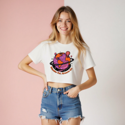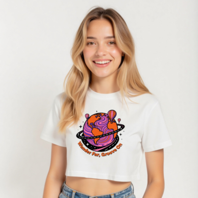 This women’s crop top features a vibrant, psychedelic globe with swirling purple and orange patterns, encircled by a road-like ring and floating hot air balloons. The playful ‘Wander Far, Groove On’ slogan adds a retro-futuristic vibe. Made for comfort and style—perfect for travel lovers and music fans. Short sleeve, relaxed fit, white base fabric.