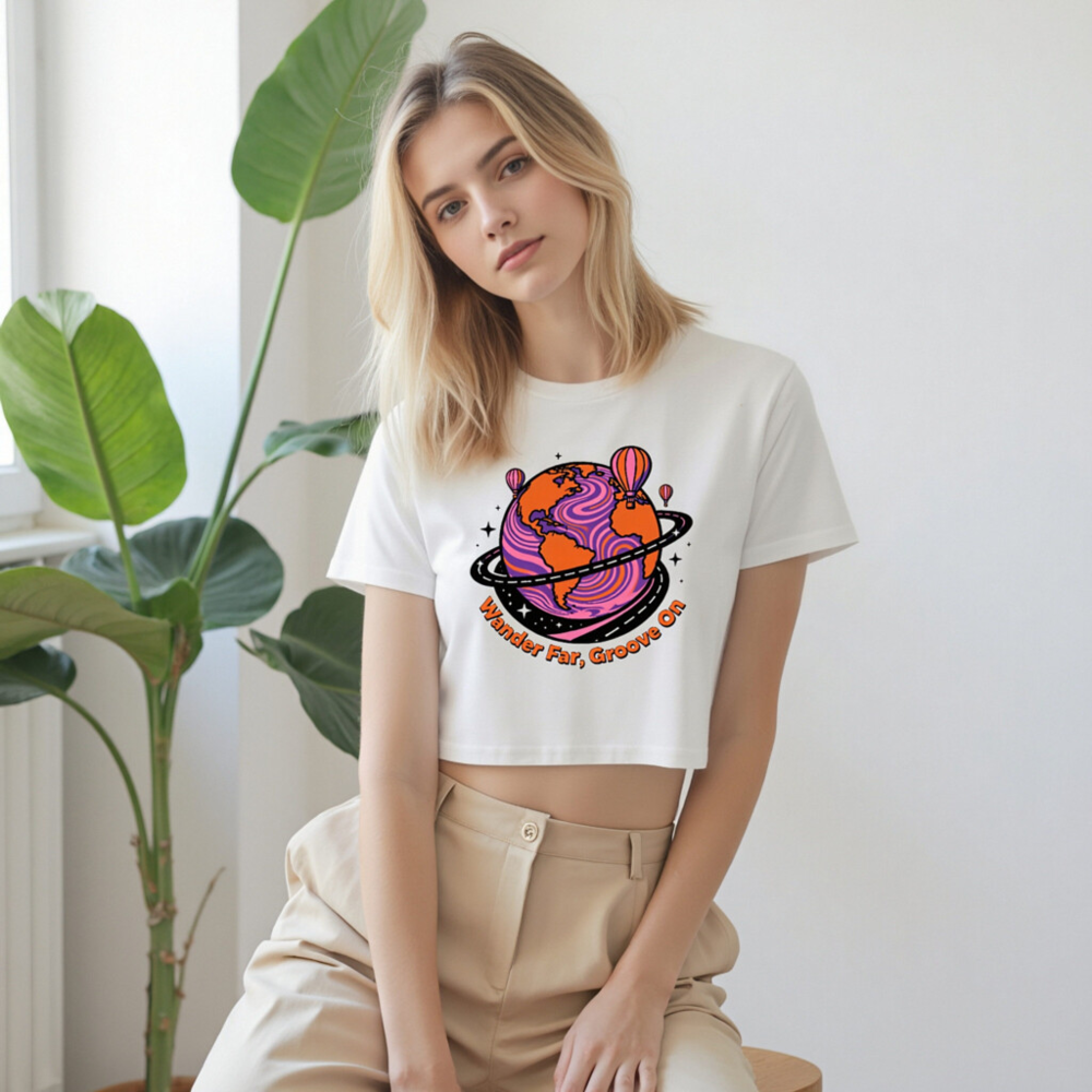 This women’s crop top features a vibrant, psychedelic globe with swirling purple and orange patterns, encircled by a road-like ring and floating hot air balloons. The playful ‘Wander Far, Groove On’ slogan adds a retro-futuristic vibe. Made for comfort and style—perfect for travel lovers and music fans. Short sleeve, relaxed fit, white base fabric.
